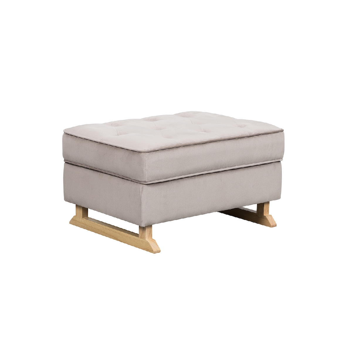 The Nursery Collective Footstool Mink Grey Natural is the perfect accompaniment to the stunning rocking chair. Fully upholstered in a luxury velvet style fabric, the new Nursery Collective Footstool coordinates perfectly with the existing collection of nursing chairs already available. A footstool provides a comfortable place to put your feet whilst relaxing in the chair. Comfortable to use when the chair is in either rocking or static mode. The footstool features clever and useful storage with a quiet gas lift hinge to easily open and close. Designed not only for enjoying with your baby during those first years but also to become a piece of furniture you keep and cherish forever in your home. Feaures: Made using a luxury plush velvet style fabric Available in a range of stunning colours to suit any nursery and home interior A comfortable place rest your feet whilst nursing and comforting your little one Beautiful pin tuck detailing Quiet and smooth gas lift dual hinge opening Generous internal storage Choose from white or natural legs Available in a selection of stylish colours to suit any nursery and home interior. Dimensions: Stool 72 x 49 x 40cm (L x W x H) Internal storage 60 x 39 x 14cm (L x w x H) Fabric 100% polyester with lacquered natural coloured rubberwood static legs, timber frame.