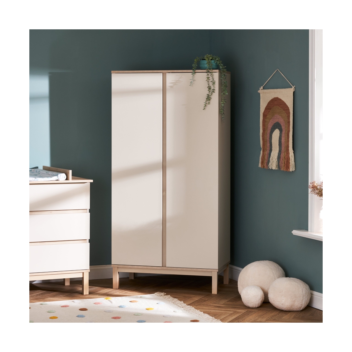 The name Astrid is of Scandinavian origin and means ?divinely beautiful?. Super modern handle-less drawers and doors this collection certainly lives up to its name. With both practicality and style, The Astrid is the perfect addition to any dream nursery. The Astrid double wardrobe is the perfect bend of practical storage space and contemporary design. The two-tone finish and no-handle doors don?t compromise on style, while the large cupboard space features two hanging rails and a single full width shelf. Putting your baby?s adorable outfits away has never been easier. Features: One large cupboard space fronted by no-handle doors One internal full-width shelf Two internal hanging rails Sleek modern craftmanship Dimensions: Dimensions: 180 × 90 × 50 cm Weight: 63. 6 kg