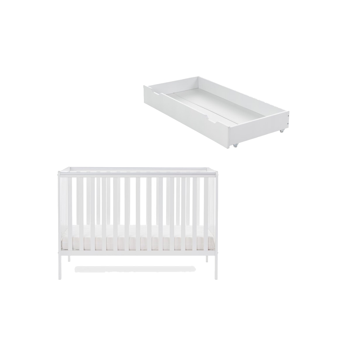 The Obaby Bantam cot offers parents fantastic features on a budget. This cot features protective teething rails, a fully open slatted design meaning you can keep an eye on your little one at all times and a three-position adjustable mattress base to ensure your little one is safe and secure from birth to approximately 18 months. Obaby?s eco-plus foam mattress is fully breathable and features 6cm thick dent resistant vented foam and hypoallergenic properties to provide tots with a sublimely comfortable night?s sleep. The mattress measures 120 x 60cm, a perfect fit for the Bantam cot, and features a fully removable cover which is washable at 60ºC, so that the piece can be kept fresh and clean for your child?s slumber. Also included in the set is the cot under drawer. With a large 73L capacity it creates a practical, space saving, storage solution for keeping your little one?s things neat and tidy. It fits neatly under the Bantam cot and the recessed handles mean it remains snag free. The durable wheels offer quick and easy access to stored items on any surface. All Obaby mattresses are designed and manufactured to comply with the General Product Safety Regulations 2005 and UK Furniture and Furnishings (Fire Safety) Regulations 1988/1989, 1993 and 2010. Crib, cot and cot bed mattresses are tested to BS 7177: 2008+A1: 2011 and BS EN16890: 2017. Features: Adjustable, three-position base height From birth – 2 years Slatted ends and sides help you keep an eye on your little one Teething rails ensure delicate teeth are protected Under drawer creates the ideal storage solution Includes perfect fitting 120 x 60cm Eco-Plus foam mattress Dimensions: Dimensions: 85cm H x 124cm L x 65cm Weight: 18. 29kg