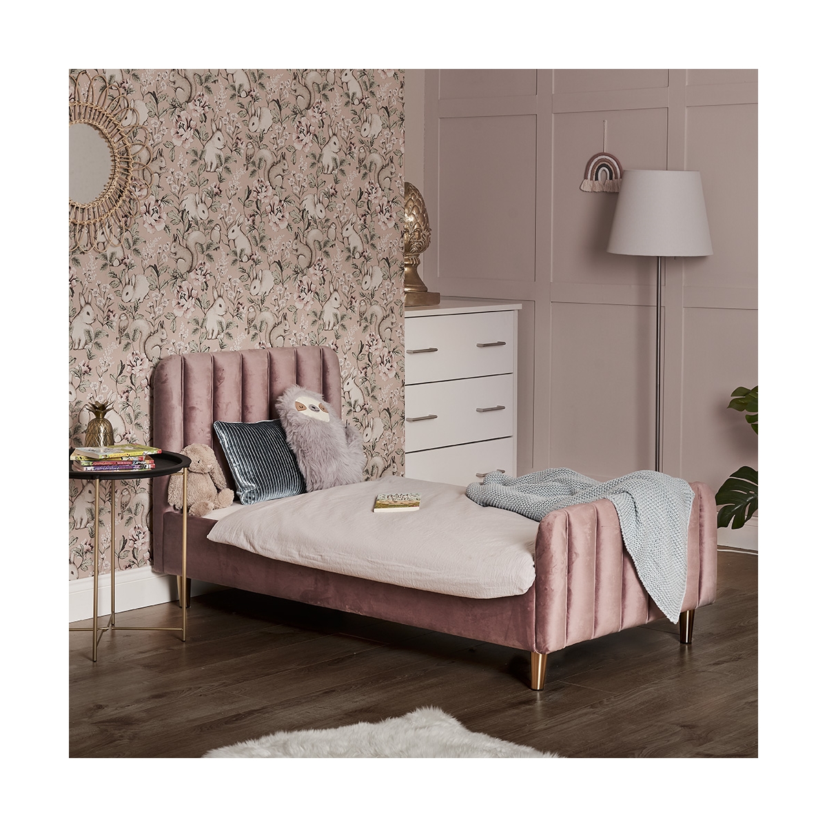 Creating a chic and luxurious feel, the Gatsby velvet bed brings a rich, revival feel to your child?s bedroom. Comprising a velvet head and foot board, this boutique-style toddler or single bed will sit perfectly in any bedroom. Once your toddler has outgrown their cot bed, the Gatsby is available in two sizes, offering the choice of a toddler bed or a regular single bed, to allow parents the ability to transition gradually should they feel that the move straight into a child?s regular bed is too daunting. Designed with little ones in mind, the Gatsby sits low to the ground, protecting them from any worrying bumps and falls. Features: Suitable from 4 years and over Low to the ground, providing better access for children Child’s single bed fits a 190 x 90cm mattress Chic and luxurious design 35% Polyester, 25% Plywood, 20% PU Foam, 15% Metal, 5% Plastic Dimensions: Dimensions: 77 x 110 x 209cm
