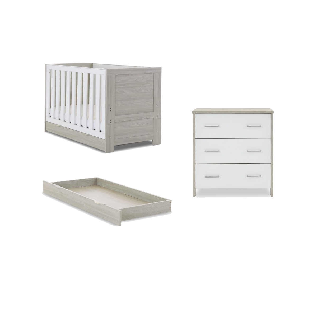 Package Includes: Obaby Nika Cot Bed & Underdrawer Obaby Nika Changing Unit Obaby Nika Cot Bed & Underdrawer The Nika cot bed has three mattress base positions, the highest allowing you to put down and pick up your newborn without straining your back through unnecessary bending. As your little one starts to develop and become more active, the mattress base can then be lowered by a further two positions keeping them safe and secure at all times while the teething rails protect their delicate first teeth. When your little one is standing confidently, the Nika can be easily transformed into a stylish toddler bed that still offers the familiarity they are used to and helps them to transition in an often-daunting time. Once transformed the toddler bed can be used until they are approximately four years old. Requires an Obaby 140 x 70cm mattress. The Obaby Nika 140 x 70cm Under Drawer features a spacious 56. 64L capacity for storage to help keep your nursery tidy and wheels for speedy access to those items. FEATURES: Textured oak wood effect finish Adjustable, three-position base height Teething rails ensure delicate teeth are protected Suitable from birth to approximately four years old Helps keep nursery tidy 56. 64L capacity Includes wheels for speedy access to items DIMENSIONS: Cot bed weight: 38kg Cot bed dimensions: 92 x 77 x 145cm Underdrawer Dimensions: 59 x 120 x 8cm Obaby Nika Changing Unit With a modern design and a beautiful textured oak effect finish, the Nika Changing Unit from Obaby will complement your nursery perfectly and last through the years. Ideal for storing those essentials and your little one?s belongings, the stylish Nika Changing Unit offers three spacious full depth drawers with stunning brushed metal handles and smooth runners for a peaceful nursery. The changing top can be attached using the discreet spring pins to avoid having screws on display and is suitable for changing mats up to 76 x 46cm. The frame removes quickly and easily when the cha