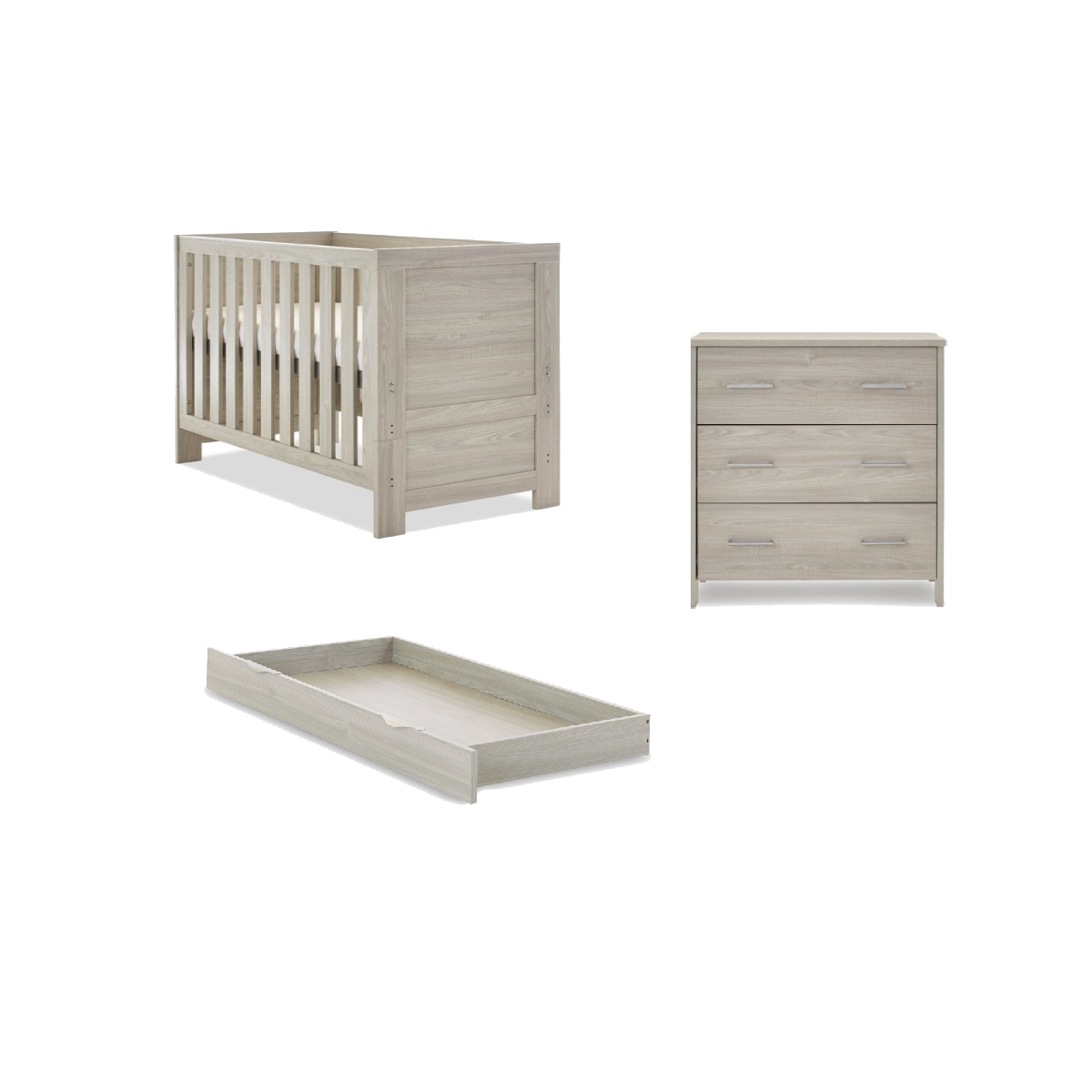 Package Includes: Obaby Nika Cot Bed & Underdrawer Obaby Nika Changing Unit Obaby Nika Cot Bed & Underdrawer The Nika cot bed has three mattress base positions, the highest allowing you to put down and pick up your newborn without straining your back through unnecessary bending. As your little one starts to develop and become more active, the mattress base can then be lowered by a further two positions keeping them safe and secure at all times while the teething rails protect their delicate first teeth. When your little one is standing confidently, the Nika can be easily transformed into a stylish toddler bed that still offers the familiarity they are used to and helps them to transition in an often-daunting time. Once transformed the toddler bed can be used until they are approximately four years old. Requires an Obaby 140 x 70cm mattress. The Obaby Nika 140 x 70cm Under Drawer features a spacious 56. 64L capacity for storage to help keep your nursery tidy and wheels for speedy access to those items. FEATURES: Textured oak wood effect finish Adjustable, three-position base height Teething rails ensure delicate teeth are protected Suitable from birth to approximately four years old Helps keep nursery tidy 56. 64L capacity Includes wheels for speedy access to items DIMENSIONS: Cot bed weight: 38kg Cot bed dimensions: 92 x 77 x 145cm Underdrawer Dimensions: 59 x 120 x 8cm Obaby Nika Changing Unit With a modern design and a beautiful textured oak effect finish, the Nika Changing Unit from Obaby will complement your nursery perfectly and last through the years. Ideal for storing those essentials and your little one?s belongings, the stylish Nika Changing Unit offers three spacious full depth drawers with stunning brushed metal handles and smooth runners for a peaceful nursery. The changing top can be attached using the discreet spring pins to avoid having screws on display and is suitable for changing mats up to 76 x 46cm. The frame removes quickly and easily when the cha