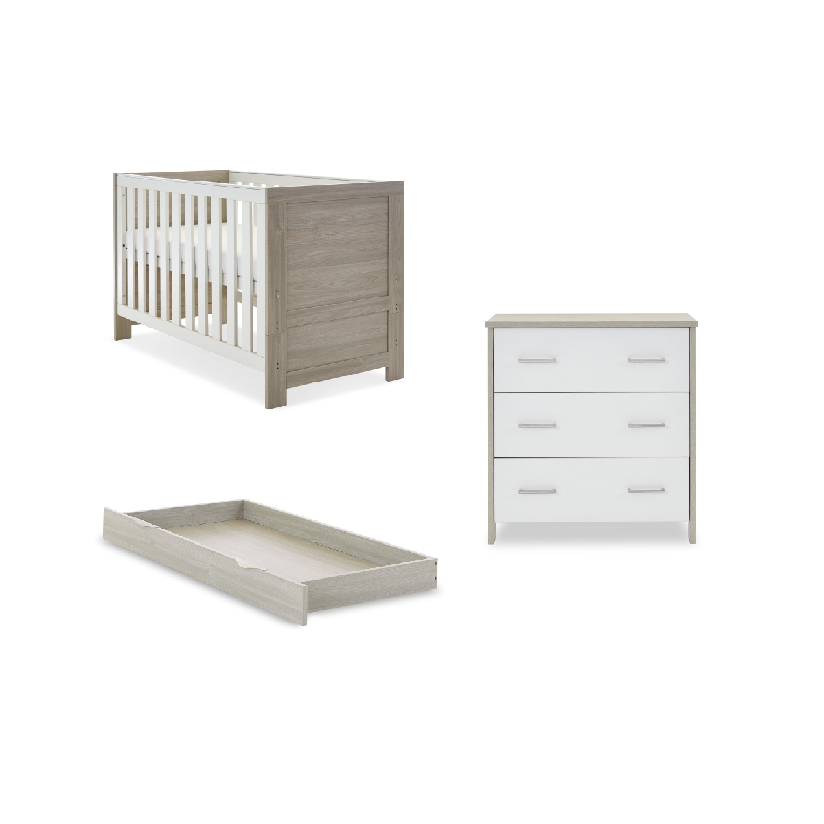 Package Includes: Nika Mini Cot Bed & Underdrawer Nika Changing Unit The Obaby Nika range offers a contemporary design, due to its clean lines and textured oak effect finish, that will fit perfectly in today?s modern nursery. This 2 piece room set consists of Nika Mini cot bed, underbed drawerand changing unit. Obaby Nika Mini Cot Bed: For the smaller nursery, Obaby have created the Nika Mini cot bed. More compact than the full-sized Nika cot bed without compromising on features, the Nika Mini has three mattress base positions, the highest allowing you to put down and pick up your newborn without straining your back through unnecessary bending. As your little one starts to develop and become more active, the mattress base can then be lowered by a further two positions keeping them safe and secure at all times while the teething rails protect their delicate first teeth. When your little one is standing confidently, the Nika can be easily transformed into a stylish toddler bed that still offers the familiarity they are used to and helps them to transition in an often-daunting time. The Nika Mini requires an Obaby 120 x 60cm mattress, available separately. For those parents looking for extra storage, the Nika mini cot bed underdrawer features a 38. 4L capacity that allows you to keep your little one?s things tidy and close to hand without taking up valuable space elsewhere. The stylish brushed metal handles and sturdy wheels make the drawer simple to use on any surface. Features: Suitable from birth to approximately 4 years old Textured oak wood effect finish Compact size for smaller nurseries Adjustable base height – 3 positions Converts from cot to toddler bed Teething rails to protect teeth Requires mattress measuring 120 x 60cm, available separately Free Obaby 5 year guarantee to UK & Ireland Includes matching 38. 4L capacity under drawer 6. 5% New Zealand Pine, 83% MDF, 10. 5% LVL Dimensions: Cot bed Weight 34. 9 kg Cot Bed Dimensions 124. 5 × 67 × 92 cm Underdrawer Dim