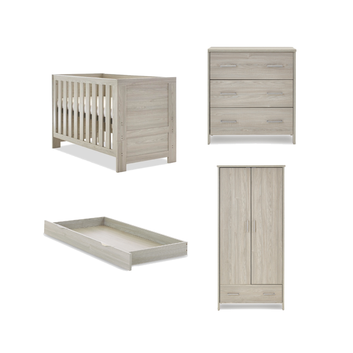PACKAGE INCLUDES: Obaby Nika Mini Cot Bed & Underdrawer Obaby Nika Changing Unit Obaby Nika Double Door Wardrobe The Obaby Nika range offers a contemporary design, due to its clean lines and textured oak effect finish, that will fit perfectly in today?s modern nursery. This 2 piece room set consists of Nika Mini cot bed, underbed drawerand changing unit. OBABY NIKA MINI COT BED: For the smaller nursery, Obaby have created the Nika Mini cot bed. More compact than the full-sized Nika cot bed without compromising on features, the Nika Mini has three mattress base positions, the highest allowing you to put down and pick up your newborn without straining your back through unnecessary bending. As your little one starts to develop and become more active, the mattress base can then be lowered by a further two positions keeping them safe and secure at all times while the teething rails protect their delicate first teeth. When your little one is standing confidently, the Nika can be easily transformed into a stylish toddler bed that still offers the familiarity they are used to and helps them to transition in an often-daunting time. The Nika Mini requires an Obaby 120 x 60cm mattress, available separately. For those parents looking for extra storage, the Nika mini cot bed underdrawer features a 38. 4L capacity that allows you to keep your little one?s things tidy and close to hand without taking up valuable space elsewhere. The stylish brushed metal handles and sturdy wheels make the drawer simple to use on any surface. Features: Suitable from birth to approximately 4 years old Textured oak wood effect finish Compact size for smaller nurseries Adjustable base height – 3 positions Converts from cot to toddler bed Teething rails to protect teeth Requires mattress measuring 120 x 60cm, available separately Free Obaby 5 year guarantee to UK & Ireland Includes matching 38. 4L capacity under drawer 6. 5% New Zealand Pine, 83% MDF, 10. 5% LVL Dimensions: Cot bed Weight 34. 9 kg Cot Bed D
