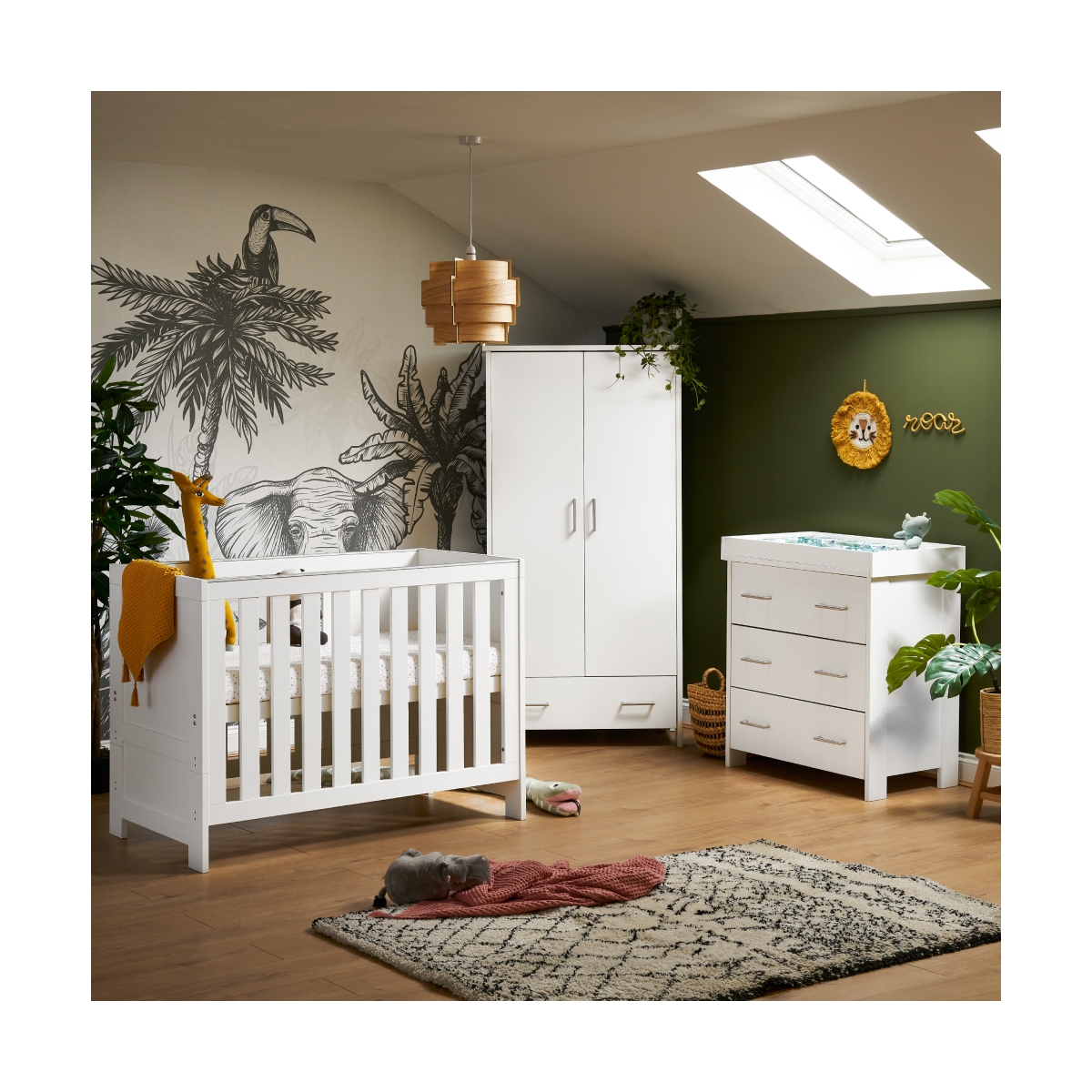 PACKAGE INCLUDES: Obaby Nika Mini Cot Bed Obaby Nika Changing Unit Obaby Nika Double Door Wardrobe The Obaby Nika range offers a contemporary design, due to its clean lines and textured effect finish, that will fit perfectly in today?s modern nursery. OBABY NIKA MINI COT BED For the smaller nursery, Obaby have created the Nika Mini cot bed. More compact than the full-sized Nika cot bed without compromising on features, the Nika Mini has three mattress base positions, the highest allowing you to put down and pick up your newborn without straining your back through unnecessary bending. As your little one starts to develop and become more active, the mattress base can then be lowered by a further two positions keeping them safe and secure at all times while the teething rails protect their delicate first teeth. When your little one is standing confidently, the Nika can be easily transformed into a stylish toddler bed that still offers the familiarity they are used to and helps them to transition in an often-daunting time. The Nika Mini requires an Obaby 120 x 60cm mattress, available separately. FEATURES: From birth – 4 years Adjustable, three-position base height Remove side rails to create a stylish toddler bed Teething rails ensure delicate teeth are protected Requires mattress measuring 120 x 60cm, available separately 6. 5% New Zealand Pine, 83% MDF, 10. 5% LVL DIMENSIONS: Size: 92 x 67 x 124. 5cm Weight: 34. 9kg OBABY NIKA CHANGING UNIT Ideal for storing those essentials and your little one?s belongings, the stylish Nika Changing Unit offers three spacious full depth drawers with stunning brushed metal handles and smooth runners for a peaceful nursery. The changing top can be attached using the discreet spring pins to avoid having screws on display and is suitable for changing mats up to 76 x 46cm. The frame removes quickly and easily when the changing space is no longer required to transform the changing unit into a practical chest of drawers. FEATURES: Three spacio