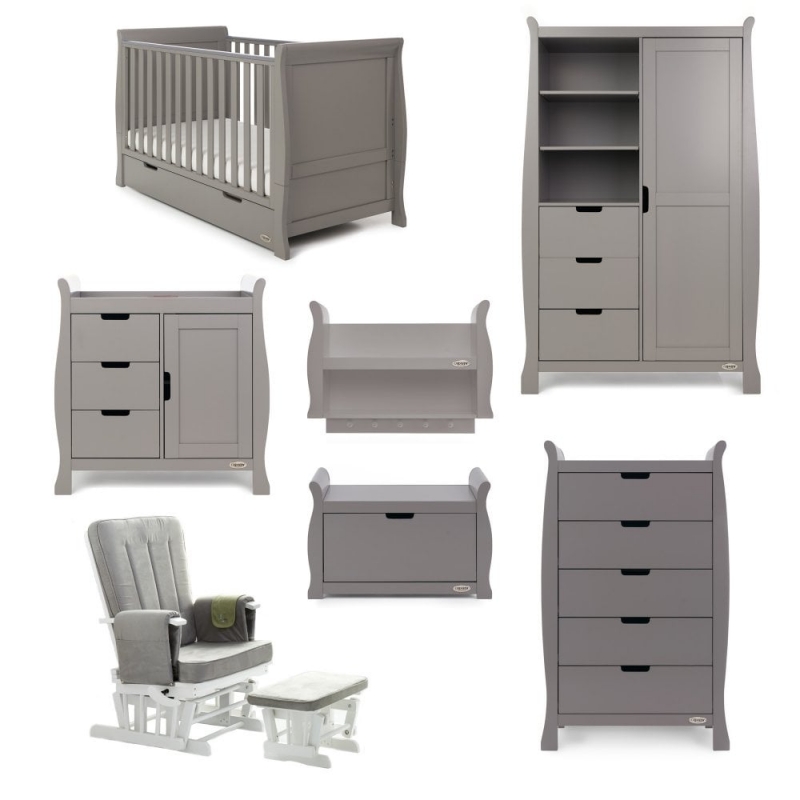 Package Includes: Obaby Stamford Classic Cot Bed Obaby Stamford Changing Unit Obaby Stamford Double Wardrobe Obaby Stamford Tall Chest Obaby Stamford Glider Chair & Stool Obaby Stamford Toy Box Obaby Stamford Shelf Stamford Cotbed & Drawer: The Obaby Stamford furniture range offers families the perfect combination of style, quality and practicality. At the heart of the range is the beautiful Stamford sleigh cot bed, with its elegant scroll design offering traditional styling with a contemporary finish. The Stamford cot bed also features a matching under drawer which slides neatly under the cot bed and offers parent?s that much needed extra storage space without taking up valuable space elsewhere. Features: Adjustable, 3 position base height End panels split for effortless transformation into a junior bed Suitable from birth to approximately 4 years old Full end panels with elegant curved, scroll design Protective teething rails for delicate teeth & gums Stylish under drawer included for extra storage Requires mattress measuring 140 x 70cm, available separately Also available as a mini cot bed, with coordinating changing unit & wardrobe available separately Free Obaby 5 year guarantee to UK & Ireland Dimensions: 91 x 76 x 154cm Weight: 37kg Stamford Changing Unit: Also part of the furniture set, the beautiful changing unit is crafted using solid wood and features the same elegant scroll design that flows through the rest of the Stamford range. Sleek lines and recessed handles create a stylish and uncluttered look, whilst ensuring it remains snag free and simple to use. It?s combination of three full depth drawers and full height cupboard with adjustable shelf and soft close door provide plenty of storage options for little one?s precious belongings, whilst the cleverly recessed section on the top of the changing unit perfectly accommodates a changing mat. Features: Changing area suitable for use from birth to 12 months One full-height cupboard with adjustable shelf a