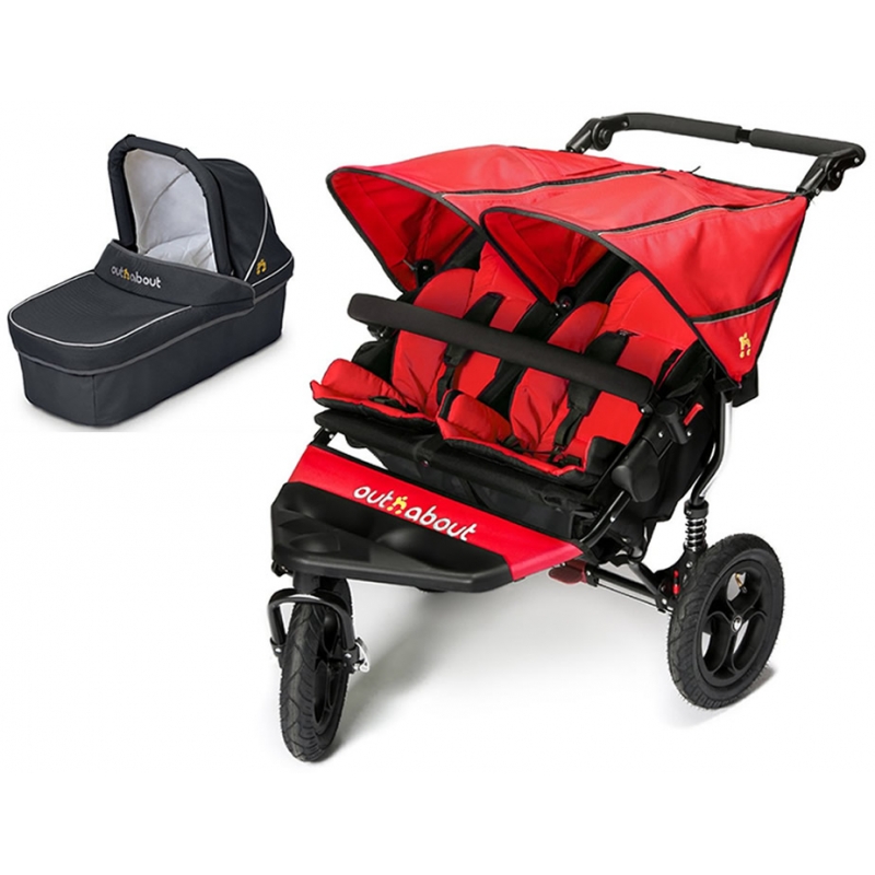 Package Includes: Out n About Nipper V4 Double Stroller Out n About Nipper Double Carrycot Out n About Nipper V4 Stroller: The award winning Nipper 360 Double boasts similar features to the Nipper 360 Single only this time there’s room for two! With its independently reclining seats the Nipper 360 Double is capable of comfortably seating two children of different ages or sizes. At a slimline 72cm wide the Nipper 360 Double fits through all standard doorways and weighing only 12. 8kg, is one of the lightest double buggies in the market today Features: Suitable from birth to 4 years (approx) This Version 4 Nipper now comes with an auto lock which will clip together once the buggy has been folded. Travel System compatible Height adjustable handle Independent rear suspension One pedal easy lock brake Quick release wheels Lockable 360 swivel front wheel Lightweight aluminium frame Multi-position reclining seat Lie flat newborn position Compact folding design Retractable sun canopy with peek-a-boo window Handy storage pockets Large shopping pouch Easy clean removable seat liner 5 point safety harness Hinged padded bumper bar Pneumatic tyres with 90 degree easy fill valve Dimensions: Size: 72cm x 96cm x 119cm Size folded: 72cm x 42cm x 90cm (wheels on) Size folded: 71cm x 36cm x 79cm (wheels off) Weight: 12. 8kg Maximum load: 22kg (50lb) per seat Age suitability: Newborn to 4 years (approx) Handle height: 77cm – 103cm Out n About Nipper Double Carrycot The Nipper Double Carrycot is suitable for use with the Nipper Double V2, V3 & V4 pushchair. The carrycot includes liner, hood, mattress and apron.