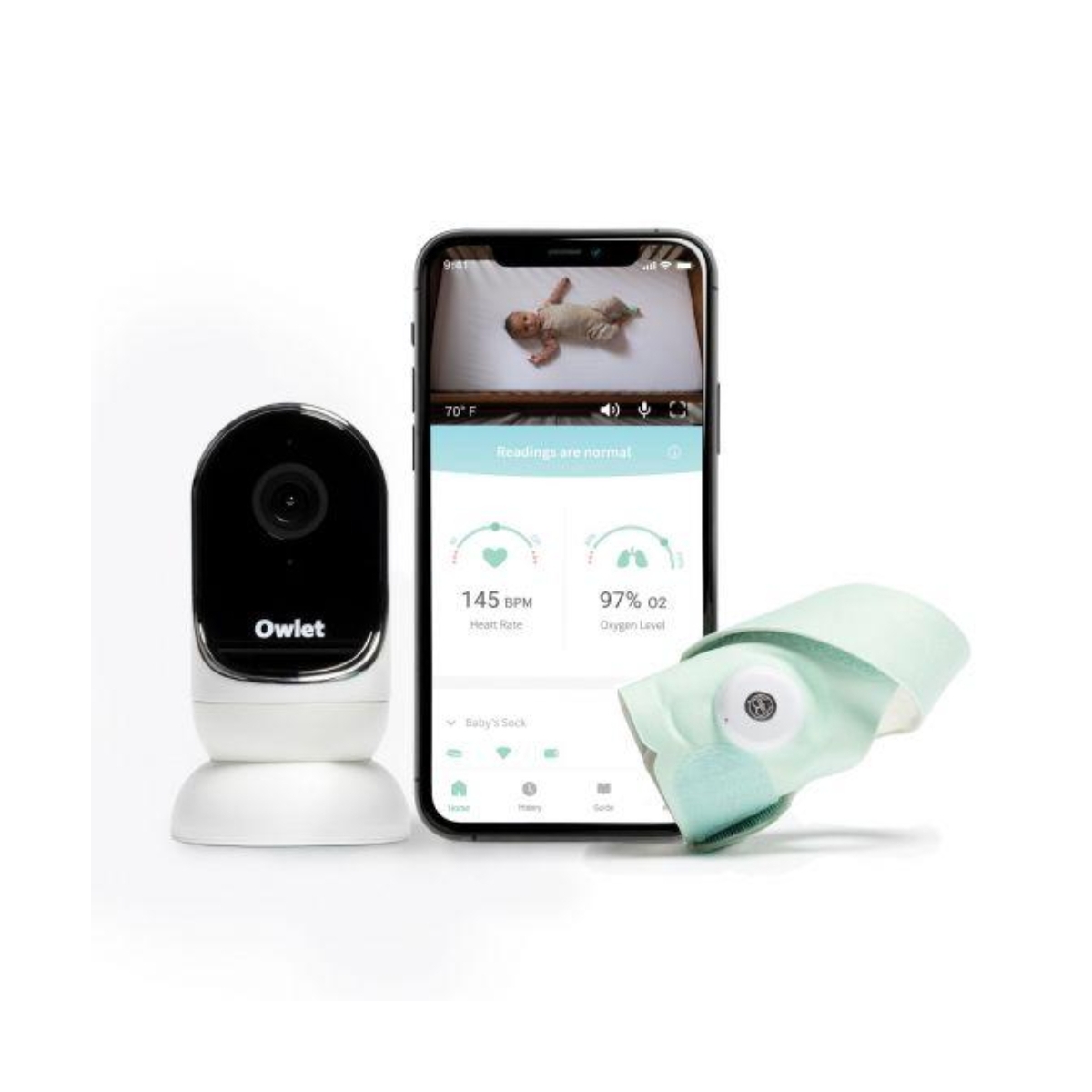 The Owlet Monitor Duo in Mint V3 combines the award-winning Smart Sock with the Camera for the most complete picture of your baby?s well-being. Track your child?s heart rate, oxygen level, and sleep trends, while streaming live HD video to your phone. View your child?s readings in real time, from anywhere, in our free App and receive notifications if readings leave preset zones, and sound and motion notifications to stay informed of your child?s needs. From the hazy newborn days to the excitement of starting school, the Duo grows with your child and is the only baby monitor you?ll ever need. This is where the Owlet Smart Sock v3 and Cam v2 comes in! It allows you to transform your smartphone into a smart baby monitor. You can stream HD1080p video and sound over a secure, encrypted connection from their room right to your phone as well as checking their heart rate and oxygen levels on the same screen. Features: Talk to your baby from your phone Secure transmission for peace of mind View your child, even in a dark room Peace of mind using clinically-proven oximetry 2 sizes of sock to grow with your child 0-18 months