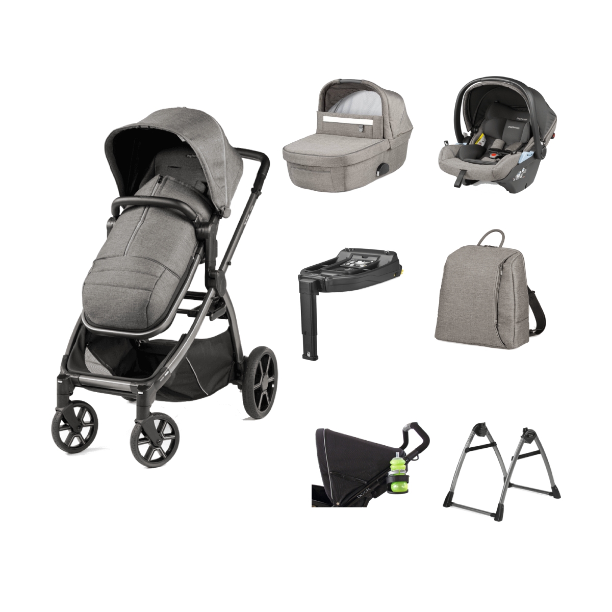 Package Includes: Peg Perego Veloce Stroller Peg Perego Veloce Stroller Raincover Peg Perego Veloce Stroller Apron Peg Perego Culla Grande Carrycot Peg Perego Culla Grande Carrycot Raincover Peg Perego Primo Viaggio Lounge Reclining i-Size Infant Car Seat Peg Perego i-Size Base Peg Perego Backpack Peg Perego Home Stand Peg Perego Stroller Cup Holder Peg Perego Veloce Stroller The Veloce stroller is exceptionally light and smooth to steer, it is only 51cm wide and has top quality wheels to ensure agile steering on all terrains. The seat unit is suitable from birth and can face rearwards (so you can interact with your baby) and forwards (so your little one can view the world around them). The soft-ride wheels, rear shock absorbers with visible springs and ball bearings ensure agile steering on all terrain. You can adjust the front wheels, from locked to swivelling and vice versa. Wheels with high-visibility finishes are ideal even in the evening walks. User-friendly brake. Steering agility is guaranteed, even with just one hand. The eco-leather handlebar ensures utmost comfort. Multiple handle adjustments for parents of different heights. The high position of the handle is very useful to save space when needed, for example in an elevator. Features: Suitable from birth – 22kg Reversible seat unit Backrest reclines in different positions 5-point safety harness Large extendible UPF 50+ hood Eco-leather bumper bar that opens and closes with ease Steering agility is guaranteed, even with just one hand Adjustable eco-leather handle bar Opens and closes with just one hand Ultra-compact fold Can fold with the seat unit attached in both directions Free-standing when folded Multi-terrain wheels Soft-ride wheels Rear shock absorbers with visible springs Ball bearings ensure agile steering on all terrains Lockable swivel front wheels Wheels have a high-visibilty finish which is ideal for evening walks User friendly brake Large easy to access basket with a reinforced bottom to all