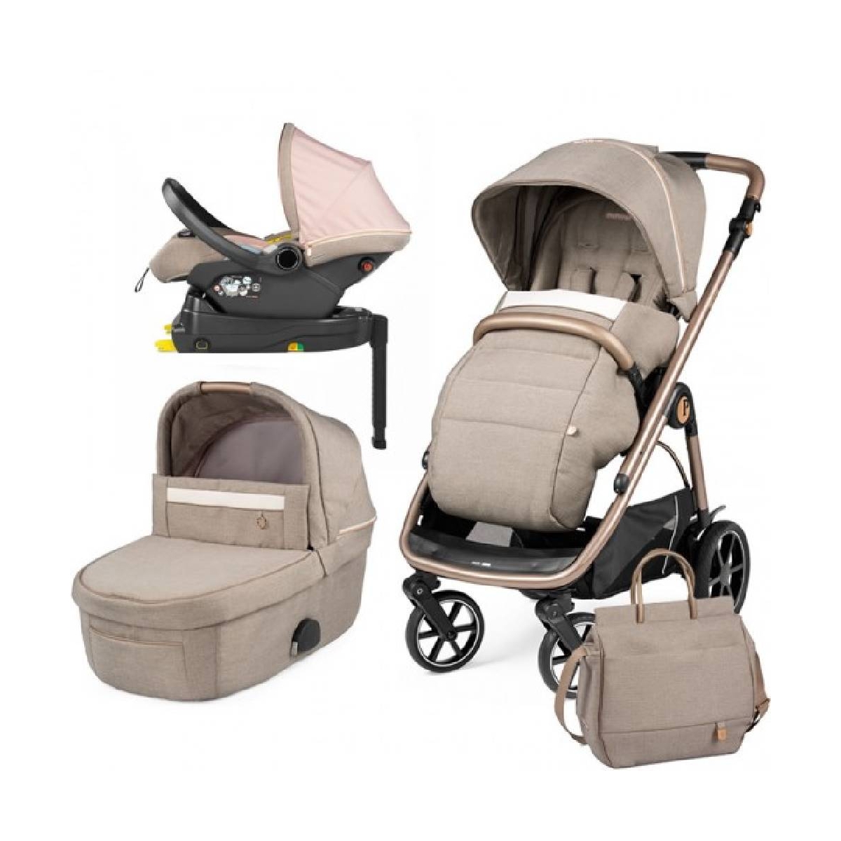 PACKAGE INCLUDES Peg Perego Chassis Peg Perego Seat unit Peg Perego Stroller raincover Peg Perego Padded pushchair apron/leg cover Peg Perego Culla Grande carrycot with safety mattress Peg Perego Carrycot raincover Peg Perego Borsa Changing Bag Primo Viaggio Lounge reclining car seat Peg Perego I-Size Base Peg Perego Veloce Lounge Modular Travel System Bundle: Stroller + Culla Grande Carrycot + Lounge Reclining Car Seat + Changing Bag – Agile. Snappy. Light. Compact. Veloce Lounge modular is the travel system made in Italy which moves in sync with your lifestyle, just like a dance, with agile and fast movements. The Veloce stroller is exceptionally light and smooth to steer, it is only 51cm wide and has top quality wheels to ensure agile steering on all terrains. The seat unit is suitable from birth and can face rearwards (so you can interact with your baby) and forwards (so your little one can view the world around them). Your baby’s rest is essential for their well-being. The large Culla Grande carrycot follows the growth of your baby with plenty of space to respect your baby’s needs. It comes with a comfortable mattress for extra cuddles! Reclinable i-Size car seat for newborns Primo Viaggio Lounge which allows your baby to lie back comfortably. Peg Perego Veloce Stroller FEATURES Suitable from birth – 22kg. Reversible seat unit. Backrest reclines in different positions. 5-point safety harness. Large extendible UPF 50+ hood. Eco-leather bumper bar that opens and closes with ease. Steering agility is guaranteed, even with just one hand. Adjustable eco-leather handle bar. Opens and closes with just one hand. Ultra-compact fold Can fold with the seat unit attached in both directions. Free-standing when folded. Multi-terrain wheels. Soft-ride wheels. Rear shock absorbers with visible springs. Ball bearings ensure agile steering on all terrains. Lockable swivel front wheels. Wheels have a high-visibilty finish which is ideal for evening walks. User friendly brake. Lar