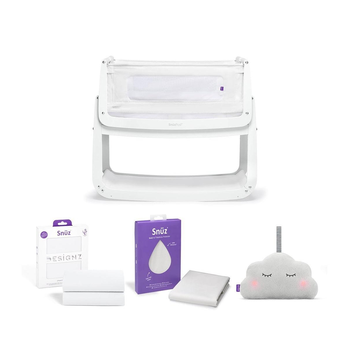 PACKAGE INCLUDES: Snuz Pod4 Bedside Crib with Mattress Snuz Crib 2 Pack Fitted Sheets Snuz Waterproof Mattress Protector Snuz Cloud Baby Sleep Aid SNUZPOD4 BEDSIDE CRIB WITH MATTRESS Feed, soothe, and be closer to your baby with the all-new Snuz Pod4 Bedside Crib! Keeping baby nearby, for a safe bonding experience. With dual-view mesh windows and a half-height zip-down wall for easy access, be by their side through every yawn, wiggle, gurgle and nap. Snuz Pod4 regulates your baby’s temperature with its innovative Comfort Air system. A combination of unique air-flow vents, air-permeable mesh liner, and base ventilation designed to increase airflow and breathability for a great night?s sleep, all around. Snuz Pod? also boasts a lightweight removable bassinet, and new breathable mattress. Snuz Pod4 packs comfort, breathability, and safety all in one expertly designed crib that will see your baby going from awake, to zzz in no time. Safety tested to the latest Bedside Crib Standard, Snuz Pod4 is a sturdy, dependable alternative to other cribs on the market. Allowing you to soothe your little one night and day, safe and sound. Now fitting more beds than any other bedside crib, Snuz Pod4 is crafted with care to ensure only the best experience for parent and baby. FEATURES: Suitable from birth to approximately 6 months Sleep well, feed easily and be closer to your baby NEW Comfort Air breathable system to help regulate temperature for a good night’s sleep NEW 3D breathable mattress included NEW machine washable mesh liner Gentle reflux incline option Lightweight lift-off bassinet for use around the home Made using quality sustainably sourced Beech solid wood and plywood Fits more beds than any other traditional bedside crib (new max. height 73cm) Included: Bed straps (fits divan, ottoman and framed beds) Meets new bedside crib safety standard BS EN 1130: 2019 DIMENSIONS: External size: L100 x 49 x H95 (maximum height) Product weight: 11. 5kg SNUZ CRIB 2 PACK FITTED SHEETS Style your C