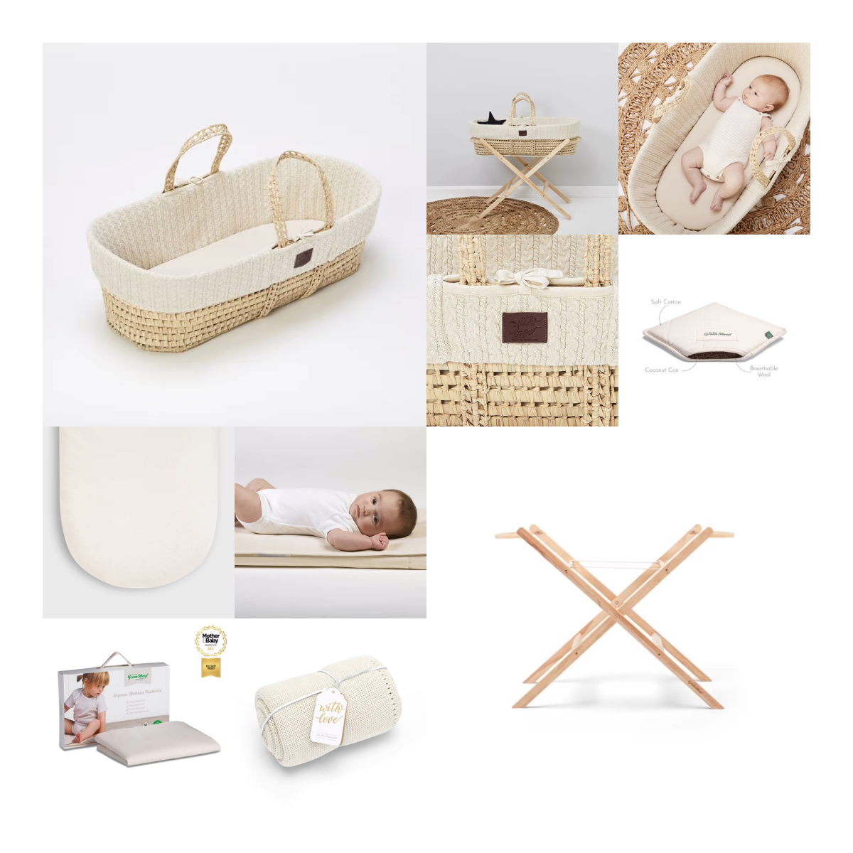 Package Includes: The Little Green Sheep Natural Knitted Moses Basket The Little Green Sheep Moses Basket Stand The Little Green Sheep Moses Basket Mattress The Little Green Sheep Moses Basket Fitted Sheet The Little Green Sheep Mattress Protector The Little Green Sheep Knitted Cellular Blanket This beautiful Moses Basket bundle is a perfect money saving package to ensure your little one is cosy from day one, including the Natural Knitted Moses Basket in your choice of colour with chemical-free mattress, moses basket stand. Little Green Sheep Natural Knitted Moses Basket & Mattress The 100% organic Little Green Sheep Natural Knitted Moses Basket helps to provide safe and comfortable sleeping surroundings for your newborn. This moses basket comes complete with a luxurious chemical-free mattress that has been exquisitely produced and designed to support baby straight from birth. The basket itself boasts natural palm leaf and is perfectly lightweight for carrying round the home and a more resilient moses basket than other Maize baskets on the market. The organic cable knit liner is incredibly soft and breathable to promote healthy air circulation and ensure your little one is comfortable. Features: Includes chemical-free mattress worth £40 Suitable from birth until approx. 3 to 4 months (or until your baby can sit up unaided) Maximum child weight: 9kg Luxurious natural palm leaf Lightweight basket for easy carrying Stunning organic cable knitted liner Machine washable cover (30°C) 100% Palm Basket 100% Certified Organic Cotton lining Dimensions: Size: L84 x W44cm Complies with British Standards BS EN 1466 The Little Green Sheep Moses Basket Stand The Little Green Sheep Moses Basket Stand is a great addition to your moses basket. There are wooden retaining bars to hold the moses basket in position securely and the stand elevates your baby to a perfect height so that you keep an eye on them beside your bed. It is suitable for use not only with the Little Green Sheep mose