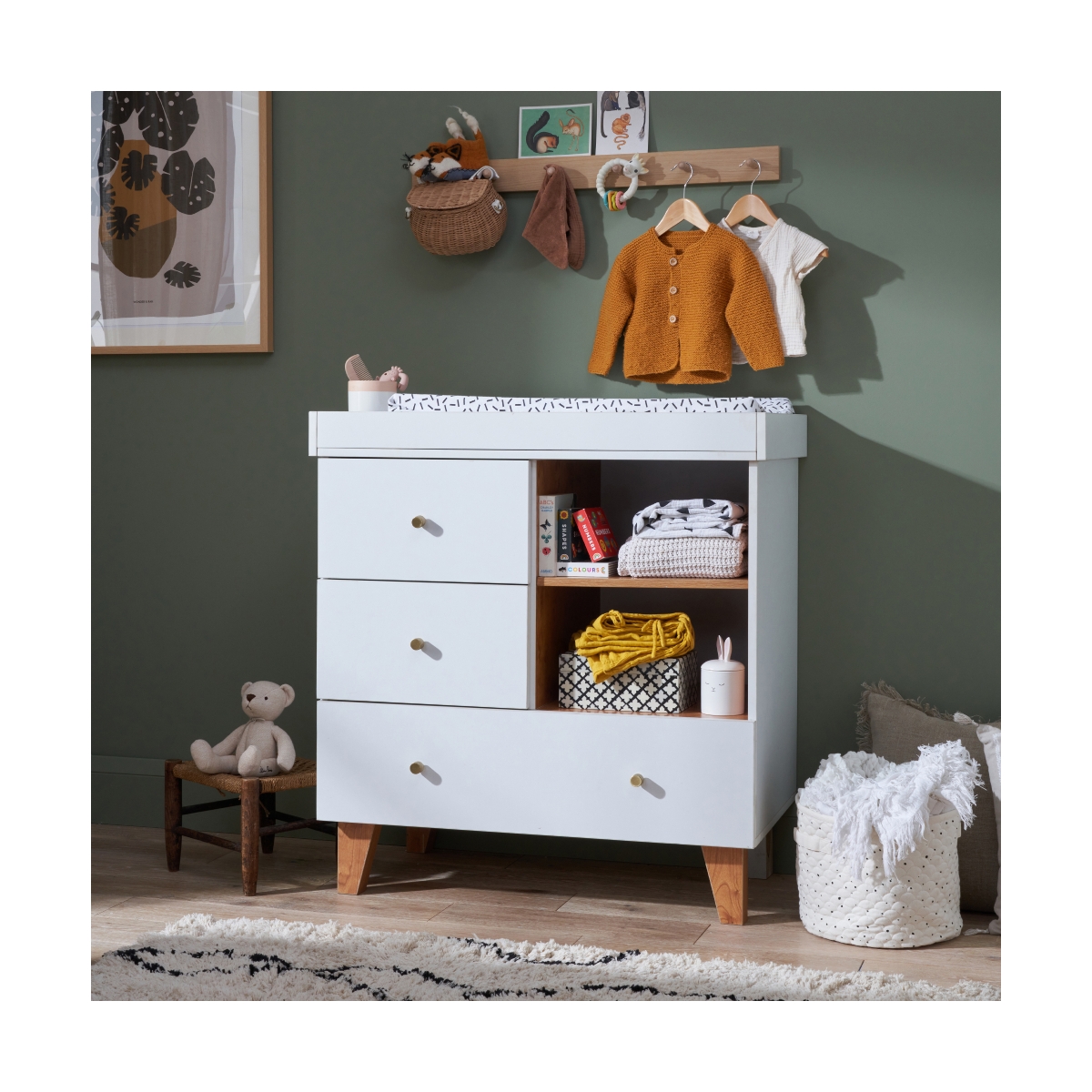 The Tutti Bambini Como Chest Changer is a stylish yet functional piece of furniture that perfectly co-ordinates with contrasting design of Como nursery collection. This modern chest offers multiple compartments including 2 open shelves and 3 drawers (one large and two small ones) with a soft-close mechanism and brush metal knobs. A removable changing top offers excellent place for nappy changing and carrying the baby after bath. It features generous area with raised edges that perfectly fits standard changing mats, leaving some space for your baby care essentials. The Como Chest Change has been tested and approved to British Standards for Safety and Performance. Features: Part of a firm and contrasting Como furniture collection Durable wooden design on 4 legs Three soft-closing drawers Two open shelves Elegant brush metal knobs Colour matching removable changing top Compliant with British Standards for Safety and Performance Requires self assembly (approx. 45 min with 2 adults) Dimensions: Dimensions: W88 x D50 x H93. 5 cm Large internal drawer size: W76 x D41. 5 x H12 cm Small internal drawer size: W34. 5 x D41. 5 x H12 cm Weight: 53 kg