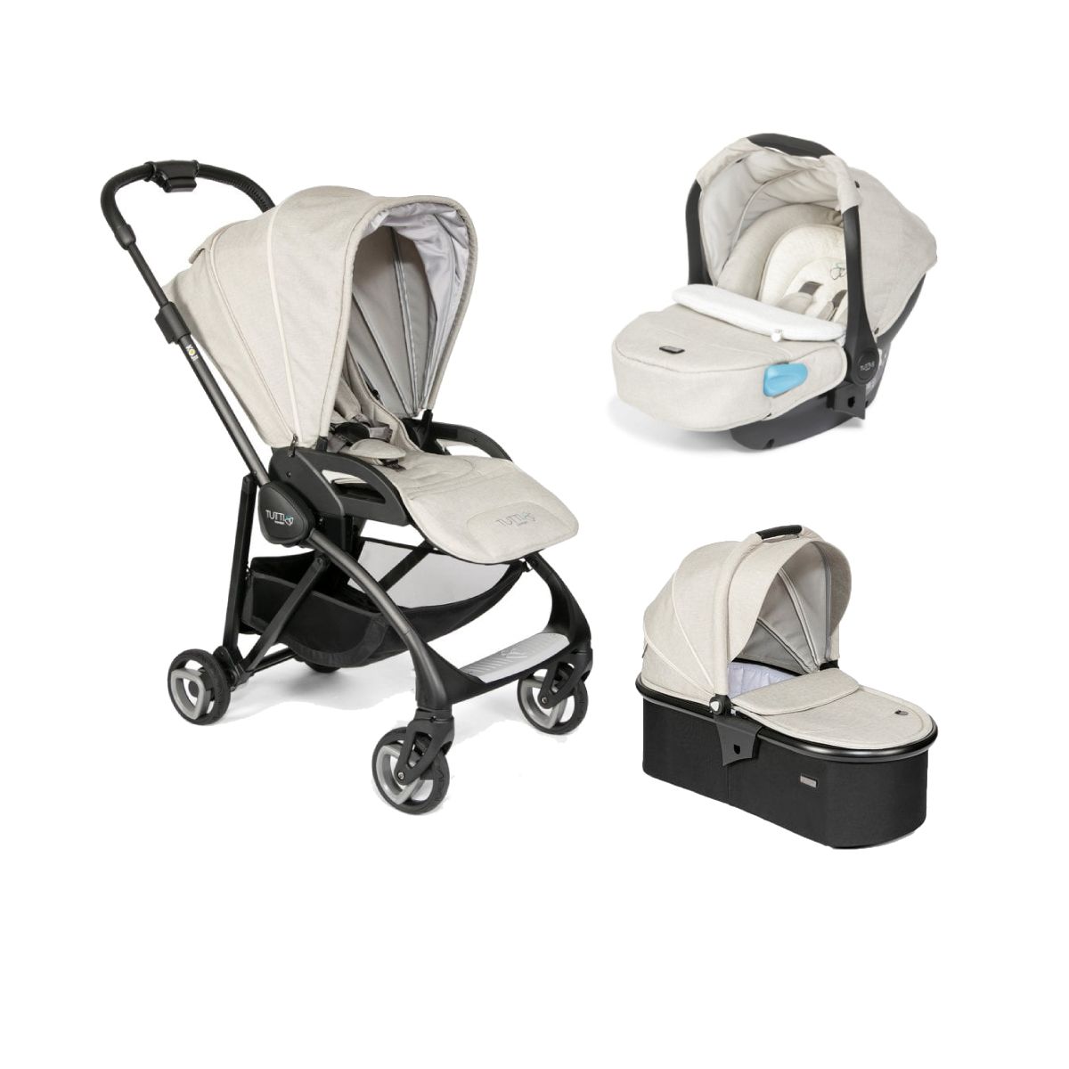 Package Includes: Tutti Bambini Koji Chassis Tutti Bambini Pushchair Colour Pack Tutti Bambini Carrycot Frame Tutti Bambini Carrycot Colour Pack Tutti Bambini By Go Car Seat Tutti Bambini Koji Pushchair The Tutti Bambini Koji has been specifically designed for urban adventures, it features a lightweight and compact chassis with an innovative one hand folding system. The Koji is suitable from Birth with its Lie-Flat seat that can be used both parent and world facing. Koji provides optimal comfort for your little one with its extendable sun canopy, padded seat liner, shoulder and crotch pads and makes things simpler and easier for parents with its 4 wheel cantilever suspension for easy manoeuvring, water and oil repellent fabrics, puncture proof PU tyres and free standing mode whilst folded. Features: Suitable from birth Features a lie-flat seat unit Forward and rear facing removable seat All round suspension for easy steering Can be folded with seat attached Single hand fold Height adjustable leatherette handle 5-point safety harness Puncture proof PU tyres for excellent grip and durability Large shopping basket with a magnetic flap providing easy access from rear Includes a hood, seat liner, shoulder and crotch pads Hood features an extendable panel, UV protective sun visor with a protective rate of UPF50+ and a concealed mesh window The padded seat liner, shoulder and crotch pads will keep your child comfortable and easily fit over the 5-point safety harness Machine washable Includes rain cover Dimensions: Dimensions: H106 x L90 x W50cm Weight: 10. 5kg Tutti Bambini Carrycot Tutti Bambini Carrycot has been specially designed to convert your Tutti Bambini pushchair into complete pram suitable from birth. This unique carrycot consists of a solid aluminium frame, extendable sun canopy, inner liner and soft mattress. Quality melange fabrics are made from water and oil resistant materials and can be easily removed to wash. Extendable sun canopy provides full coverage from