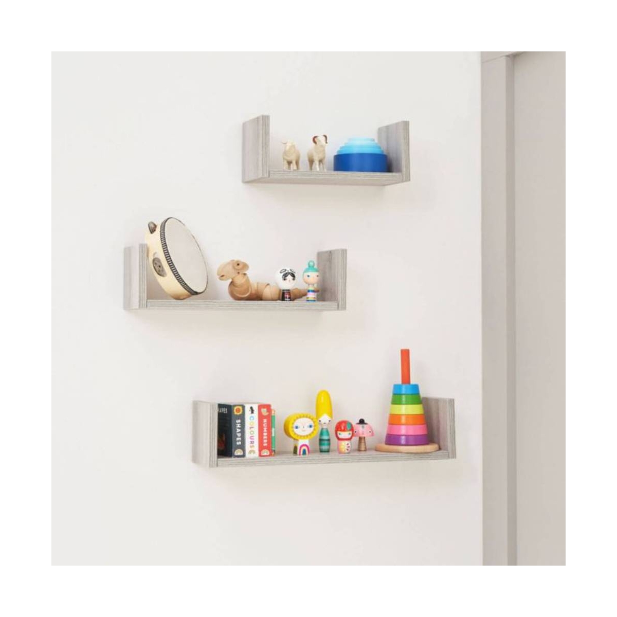 This stylish set of Tutti Bambini Modena U-Shaped Wall Shelves allow you to create additional storing spaces for books, toys, photo frames, decorations and nursery accessories in child’s room. The shape and colour of the shelves perfectly coordinates with Tutti Bambini Modena furniture range. The set includes 3 floating shelves in different sizes – small, medium and large. Each shelf has supports on both ends and can hold up 3 kg of weight. FEATURES: Creates extra storage for books, toys and decors Includes 3 U-shaped shelves – small, medium and large Perfectly coordinates with Modena furniture range Made from Engineered Wood Requires self assembly Includes wall fixtures DIMENSIONS: Small shelf: H12 x W28 x D12 cm Medium shelf: H12 x W38 x D12 cm Large shelf: H12 x W48 x D12 cm Thickness of panels: 1. 6 cm Weight: Small shelf: 0. 7 kg, Medium shelf: 0. 85 kg, Large shelf: 1 kg Weight capacity: 3 kg (each shelf)