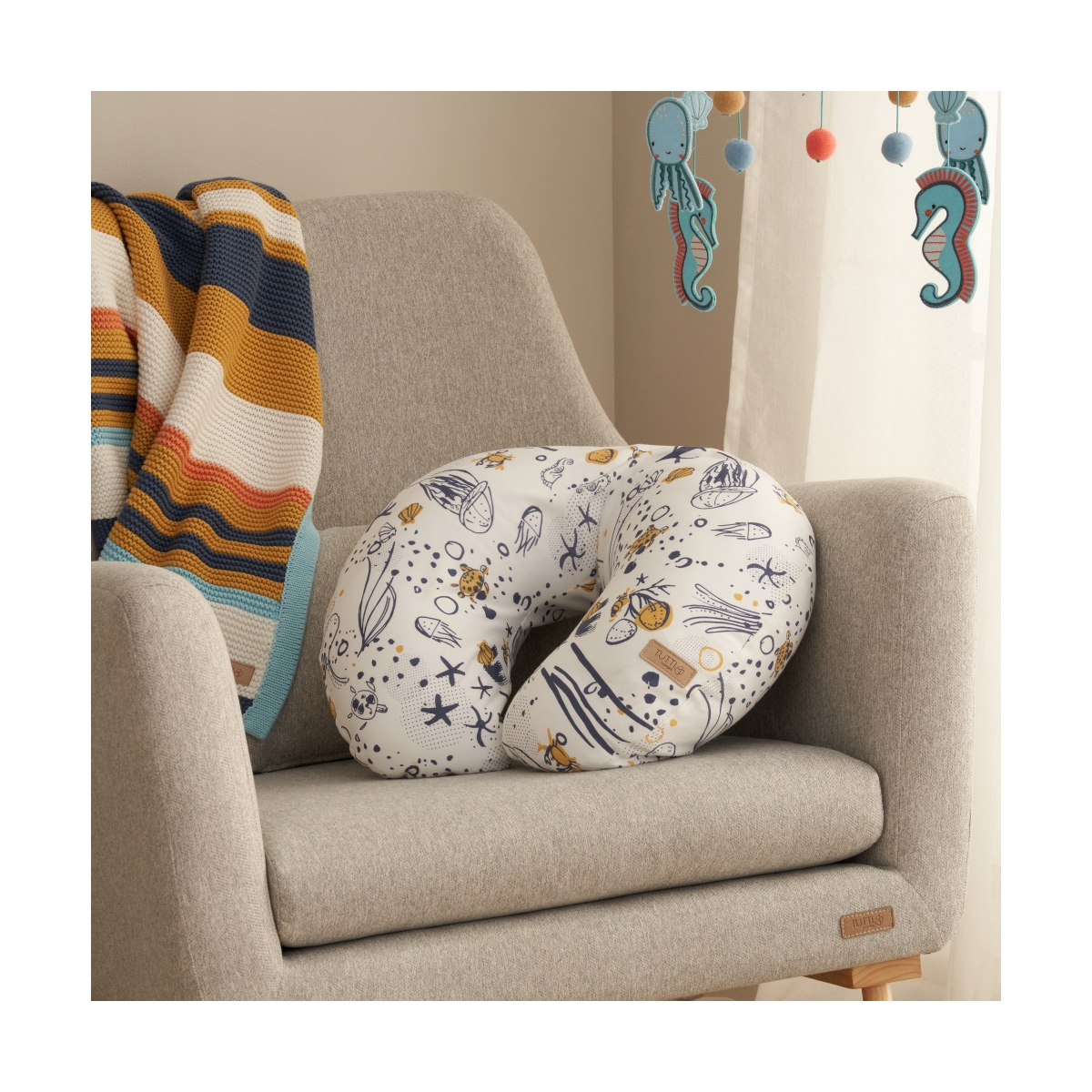 Made from sustainable bamboo cotton and bean filled, our feeding pillow offers a supportive and ergonomic design as the filling adapts to the individual. Its structure is comfortable for both nursing mother and infant, enabling the most optimum feeding position. The pillow helps position the baby?s head in the correct feeding position allowing ?hands free? feeding and preventing unnecessary strain on nursing mother’s upper and lower back. Part of the Our Planet collection, it features marine colours and sea life motifs. Features: Inject energy and aquatic magic into your child?s nursery with the Our Planet collection, bringing a nautical adventure feel through its sea creature motifs and bold colours Our Planet feeding pillows feature an intricate sea-life print in exuberant ochre and navy to carry on the aesthetic of the collection Offering a supportive and ergonomic design, our bean filled feeding pillows adapt to the individual Comfort is very important to us, so to prevent unnecessary strain on a nursing mother?s upper back, our feeding pillows are designed to help position the baby?s head in the correct feeding position to allow ?hands free? feeding Its structure is comfortable, enabling the most optimum feeding position for both nursing and bottle-feeding mother and baby The cover of our feeding pillows can easily be zipped off and are machine wash compatible Made from the softest bamboo cotton, this durable fabric has long lasting qualities even when washed multiple times Material: Outer & Lining – 70% Viscose made from Bamboo/30% Cotton, Inner Cover – 100% Polyester, Inner Filling ? Non-toxic EPS beans Dimensions: Dimensions: 55 X 42 cm