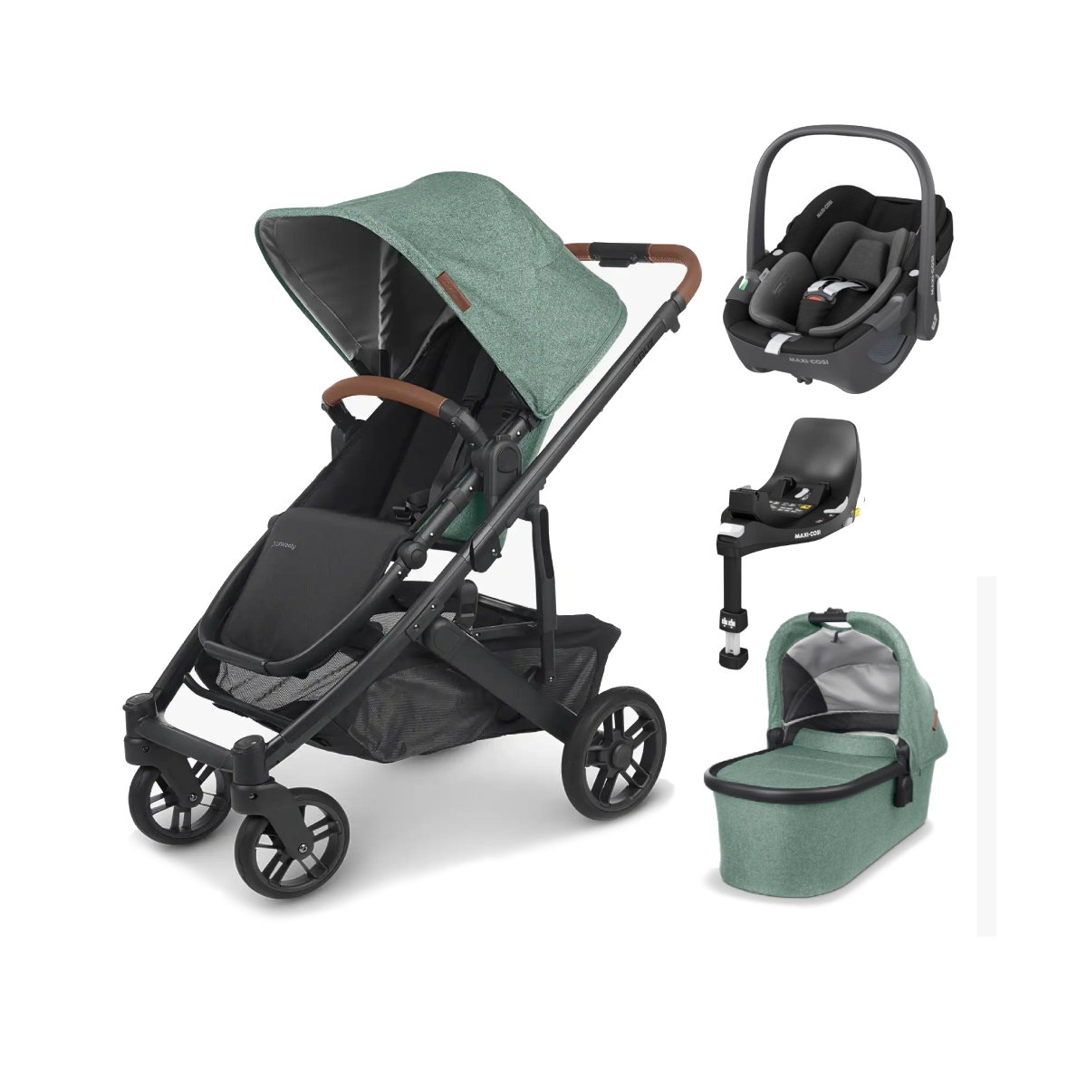 This Package Includes: UPPAbaby Cruz V2 Chasis – Carbon UPPAbaby Cruz V2 Seat Unit – Sage Green Melange UPPAbaby Carrycot – Sage Green Melange UPPAbaby Pushchair/Carrycot Rainshield UPPAbaby Pushchair/Carrycot Insect Net UPPAbaby Pushchair/Carrycot Sunshade Maxi Cosi Pebble 360 Group 0+ Car Seat – Essential Black Maxi Cosi Family Fix 360 Base UPPAbaby Cruz V2 Pushchair The Uppababy Cruz V2 is a stylish, versatile and streamlined stroller designed to make navigating urban environments easier than ever! The Cruz V2 improves on the already iconic Cruz with a Zip-out extended canopy with UPF 50+ protection, Five-point no-rethread harness, dual-action rear suspension, front spring-loaded suspension, larger, easy-access basket with added storage pockets, self-standing fold and larger front and rear tyres. The Pushchair sports a lightweight and durable chassis, One-handed, multi-position recline and handlebar adjustment, One-handed articulating bumper bar, One step self-standing fold (with or with seat unit attached) and removable and washable fabrics. The Cruz V2 enables an expandable configuration making it suitable from birth when used with the UPPAbaby Carry Cot or New Born Insert (sold separately), the pushchair has dual-action suspension on all wheels auto-adjusts for baby’s weight on the rear for a smooth ride for baby whilst the adjustable leather handle, bumper bar covers and large capacity basket makes for comfortable use for you. This makes the V2 the ideal solution for growing families. Features: Suitable from ages from 6 months to 22kg Full-size reversible seat with higher back and deeper footrest Five-point, no rethread harness Dual-action rear suspension with larger tyres Spring Loaded front suspension with larger tyres Extra large, easy access shopping basket with added storage pockets Zip out Extended canopy with UPF 50+ protection Swivel/lockable front wheels with visual indicator Lightweight and durable chassis Expandable configuration One-handed, multi