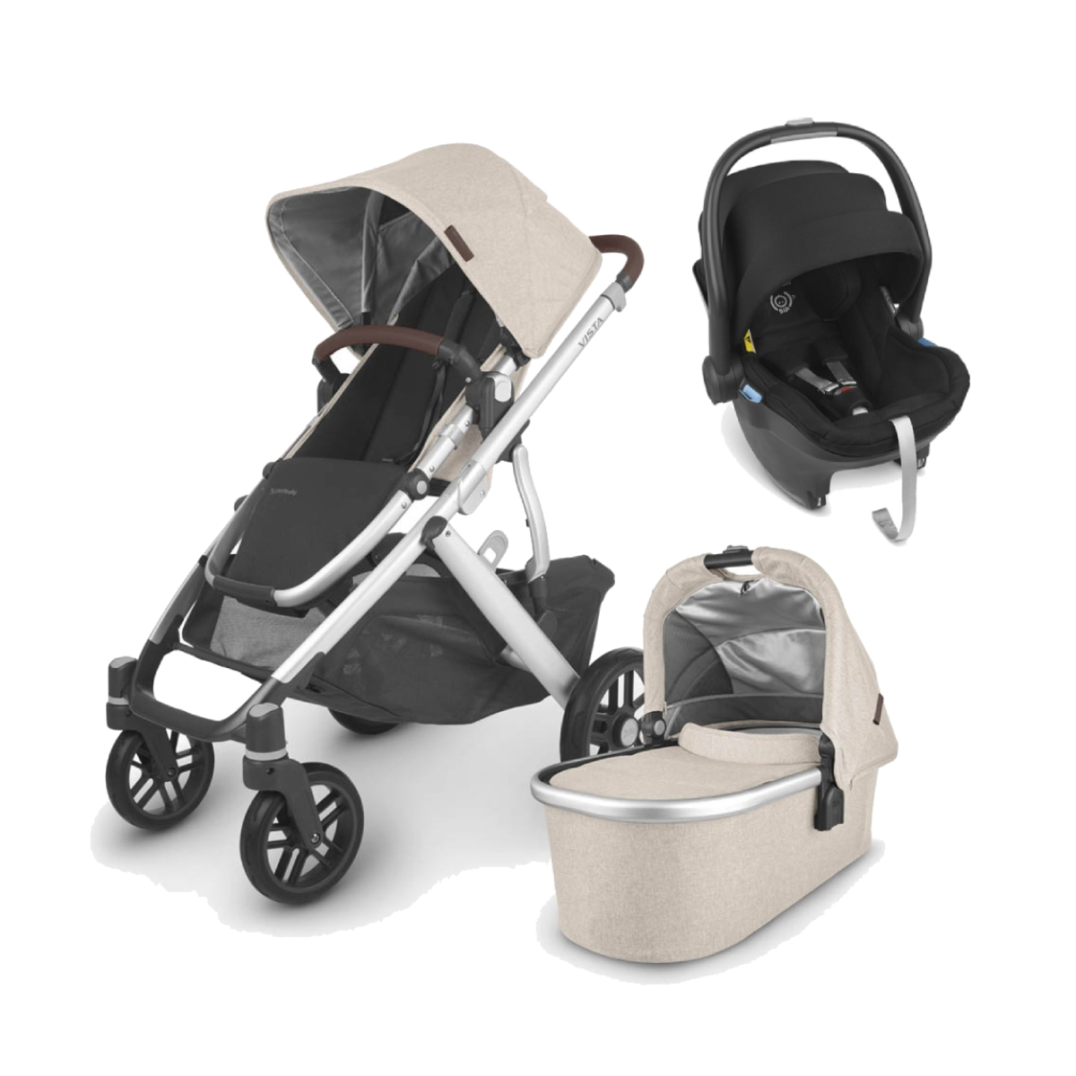 Package Includes: Vista Pushchair Vista Carrycot Mesa Infant Car Seat Vista Pushchair The UPPAbaby VISTA has an intuitive design that allows for multiple configurations, making transporting asecond and third child a breeze ? all while strolling like a single pushchair. The UPPAbaby VISTA will make travelling with your little one easy, the carrycot is ideal for sleeping and also has a reversible seat, extra large shopping basket, shock-absorbing front & rear suspension for a smooth ride, a foot push-on/off brake system and adjustable SPF 50+ sun canopy. Features: Suitable from 3 months to 50lbs (from Brith with Carrycot) Expandable seat selections that allow for two forward and parent-facing, reclining seats; two MESA infant car seats, two bassinets and countless other combinations 100% full-grain leather accents Full-size front and rear facing Toddler Seat One-handed, multi-position recline Extendable, pop out UPF 50+ sunshade Adjustable canopy and one-button telescoping handlebar One-hand release, pivoting bumper bar for easy loading Fabrics are removable and washable Shock-absorbing front and rear suspension Extra-large, easy-access basket with 30 lbs weight limit Combines aluminum with magnesium for optimal lightweight, durable performance One-step fold, with or without Toddler Seat attached, and stands when folded All-weather protection with included Toddler Seat Rain Shield and Bug Shield Dimensions: Unfolded: 91. 4 L × 65. 3 W × 100. 3 H cm Folded with seat attached: 44 L × 65. 3 W × 84. 5 H cm Folded without seat attached: 33 L × 65. 3 W × 81. 3 H cm Vista Carrycot Transform your VISTA into a pram ideal for your newborn. Whether for naps on the go or overnight sleeping, the Carrycot allows your baby to lie completely flat. Features: Suitable from birth to 9kg, Carrycot suitable for overnight sleeping Perforated mattress pad, vented base and canopy allow for added breathability Extendable pop out UPF 50+ sunshade The back of the carrycot canopy unzips for additional