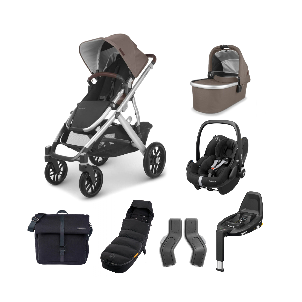 This Package Includes: UPPAbaby Vista V2 Chasis – Silver UPPAbaby Vista V2 Seat Unit – Dark Taupe UPPAbaby Vista V2 Carrycot – Dark Taupe/Silver UPPAbaby Pushchair/Carrycot Rainshield UPPAbaby Pushchair/Carrycot Insect Net UPPAbaby Pushchair/Carrycot Sunshade Maxi Cosi Pebble Pro Group 0+ Car Seat – Essential Black Maxi Cosi Family Fix 360 Base UPPAbaby Extended Upper Car Seat Adapter for Maxi Cosi Baba Bing Day Tripper DLX Changing Bag – Black Canvas Baba Bing Ubersnug Footmuff – Black UPPAbaby Vista V2 Pushchair The VISTA V2 is a versatile single stroller which can grow with your family. Its intuitive design allows for multiple configurations, making transporting a second and third child a breeze – all while strolling like a single. Designed for practical use for young families, this pushchair has suspension on all wheels, adjustable handle height and real leather handle and bumper bar covers. Features: Suitable from 6 months to 22kg Ability to transport up to three children with Rumble Seat and Piggy Back accessories Full-size reversible Seat Unit Five-point, no-rethread harness Extendable canopy with UPF 50+ protection, zip out fabric and mesh panels Vented peekaboo window One-handed, multi-position recline Adjustable handlebar Extra-large, easy-access basket with 13. 6 kg weight limit All-wheel suspension Front wheel locks with visual indicators MESA i-SIZE Infant Car Seat attaches directly to pushchair without adapters 100% full-grain leather accents One-step fold, stands when folded Dimensions: Unfolded: L 91. 4 x W 65. 3 x H 100. 3H cm Folded with seat attached: L 44 x W 65. 3 x H 100. 3 cm Folded without seat attached: L 33 x W 65. 3 x H 81. 3 cm Frame + Seat: 12. 4 kg Frame: 9. 1 kg Seat: 3. 3 kg True weight: 12. 4kg UPPAbaby Vista V2 Carrycot The Uppababy V2 Carrycot has several handy features to keep both you and your little one happy whilst out and about in your Uppababy Stroller. It has been equipped with extendable UPF50 canopy and has a zip that allows for extra air