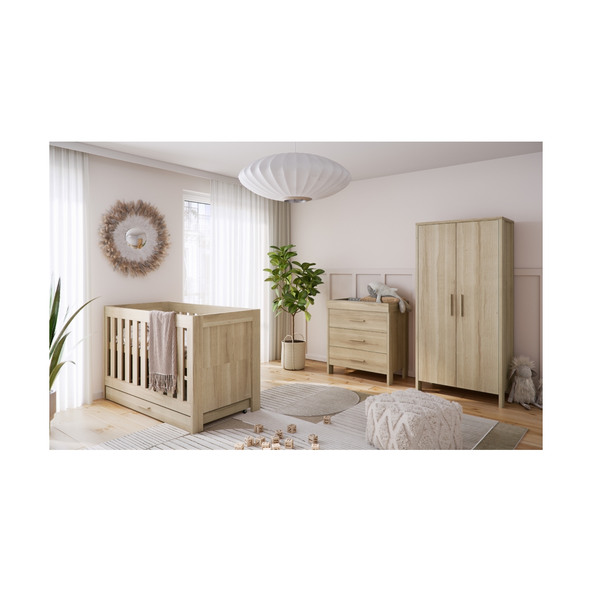 PACKAGE INCLUDES: Venicci Forenzo Cot Bed with Undrawer Venicci Forenzo Chest Venicci Forenzo Wardrobe VENICCI FORENZO COT BED WITH UNDRAWER The beautiful Forenzo collection is a reaction to parents? needs and their little ones too. This cot bed is characterized by an attractive reproduction of the structures and colors of wood, thanks to which it brings peace and a cozy atmosphere to the room. The Venicci team consists not only of designers, but also parents, so we know how important it is to use the space optimally. In this collection, the cot bed has an additional drawer, thanks to which we gain extra space for storing things. We have created furniture that grows with the child, but in order to serve for many years, we have devoted a lot of attention to durability. High-quality materials used in the production, guarantee the stability and smooth operation of doors and drawers. Sleeping is the basis for your baby?s healthy development. That is why our furniture complies with the highest standards. The materials used in production do not cause allergies and are easy to clean, making them a good choice in the rooms of small allergy sufferers. When the baby?s crib is too small for him, you can easily turn it into a great-looking toddler bed. What?s more, the roomy drawer provides additional storage space. The ability to vary the height of the base on three levels is a smart way to adjust it to suit your child?s needs. It is also a useful solution for maintaining a healthy spine and not putting strain on it when bending down to your baby. Features: Adjustable base height 3 different height settings to match each stage of baby?s development Grows with the child It can be converted into a toddler bed which can used up to 4 years of age Highest quality workmanship Fittings and boards used are durable and can serve for years Additional protection against mechanical damage Additional drawer Gain extra room for storage Coordinates with Forenzo furniture Dimensions: Measurem