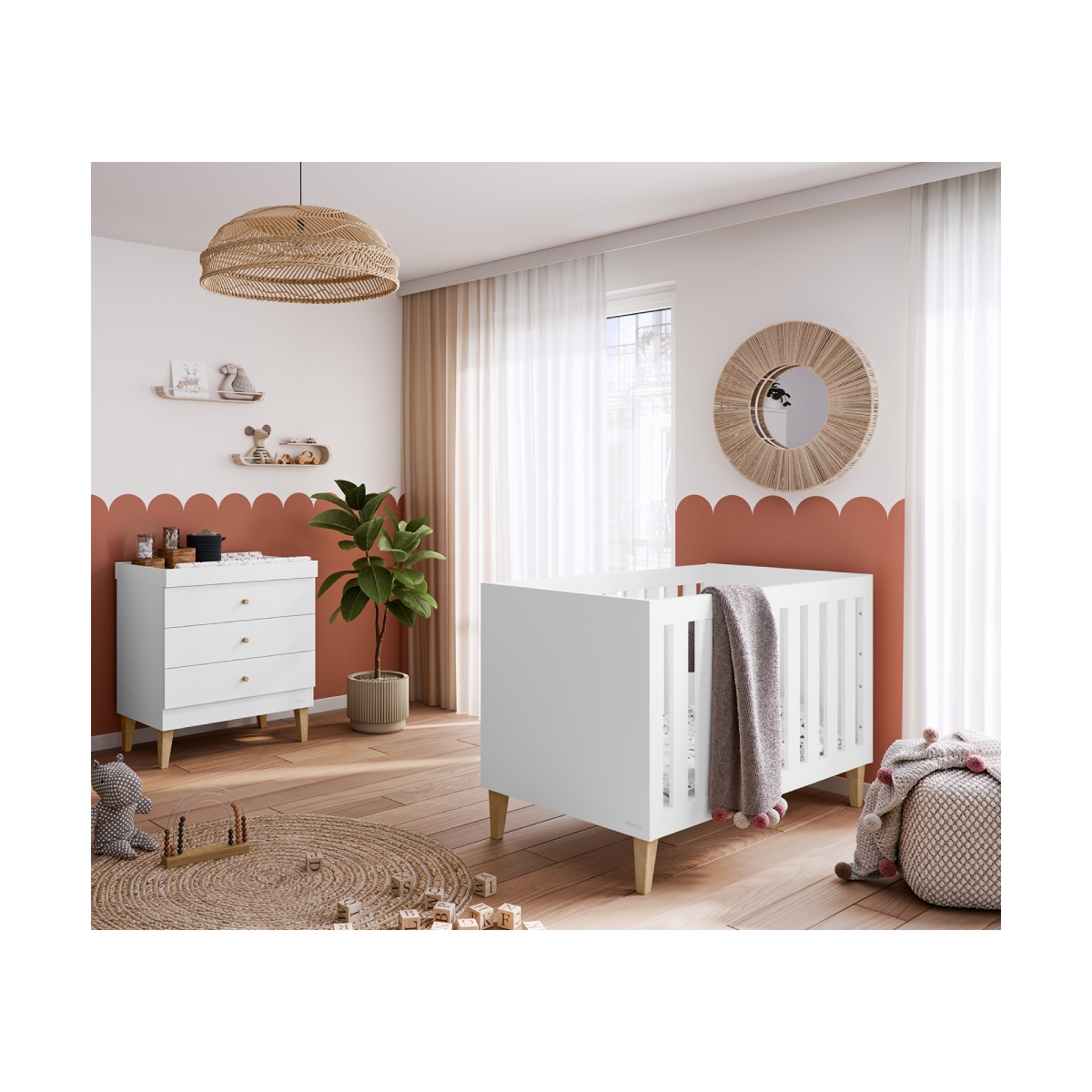 Package Includes: Venicci Saluzzo Cot Bed Venicci Saluzzo Chest Venicci Saluzzo Cot Bed The crib has been designed so that it grows with the child – later you can easily turn it into a comfortable toddler bed. In addition, it has three base heights, which is an extremely ergonomic solution for parents who, especially at the beginning, bend down a lot to their babies. We also took care of the frame that guarantees proper ventilation. A modern, yet simple collection in a hybrid Scandinavian style. Designed not only for babies, but for parents as well. Focused on ergonomic design, supporting the healthy development of the toddler, thanks to the solutions used. Its minimalism is conducive to allergy sufferers – the lack of unnecessary shelves reduces the deposition of dust, and thanks to the lifting obtained by the legs, you can easily clean hard-to-reach places. When you decide to buy a Saluzzo set, you buy furniture for years – the crib will be sufficient up to 4 years of age, and the highest quality of fittings and other materials will ensure its durability. Each element of this collection has been enriched with wooden legs made of varnished oak. Thanks to them, the collection becomes cozier, which supports relaxation. Features: Adjustable base height 3 different height settings to match each stage of baby?s development Grows with the child It can be converted into a toddler bed which can used up to 4 years of age Highest quality workmanship Fittings and boards used are durable and can serve for years Additional protection against mechanical damage Gain extra room for storage Paints and other elements used are non-allergenic and tested for safety for use on baby furniture Takes mattress size 140cm x 70cm Dimensions: Dimensions: H93cm x L145cm x W75cm Venicci Saluzzo Chest The Saluzzo chest of drawers has a removable changing table, which is essential equipment for new parents. Ergonomics was also considered here – placing the changing table in this place is the optim