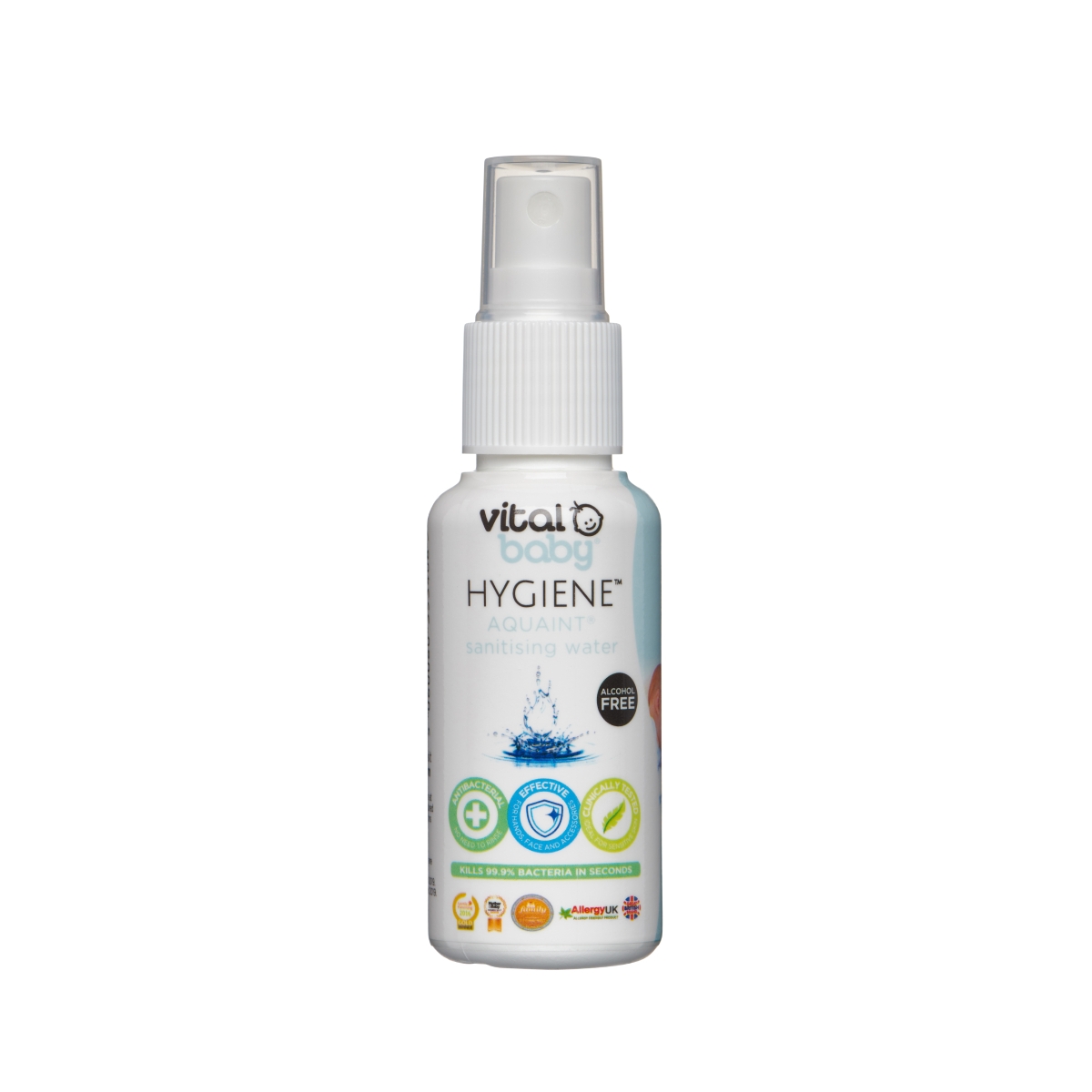 Suitable for 0+ months. Kills 99. 9% of germs in seconds. Fragrance and alcohol free. Endorsed by Allergy UK. 100% natural cleansing water. 1 x 50ml Bottle of Vital Baby AQUAINT Sanitising Water. All parents know what it is like when baby drops their soother or bottle on the floor, you have no way of cleaning It and nothing else will pacify your little one. Vital Baby have found the answer. Vital Baby aquaint sanitising water is a revolutionary 100% natural cleansing water that kills 99. 9% of bacteria in seconds. Simply spray onto any surface (even if it is going into the mouth) and it is sanitised. There is no need to rinse nor wipe, and can be used on any surface and even on the body from new-born. The water provides the base for it to be highly effective as a cleanser, the only other ingredient, a natural acid (hypochlorous acid) that is produced in the human body to fight bacteria and germs, provides its antibacterial properties. The 500 ml bottle of aquaint sanitising water is great for use around the home to instantly sanitise worktops, highchairs and much more. Features: Can be safely used on the body (from birth) or on any hard surface, endorsed by allergy uk and suitable for people with allergies or sensitive skin Good to sanitise soothers, teethers and feeding equipment when at home or when out and about, safe to use on any surface designed to come into contact with a baby’s mouth, Odour Free, Tasteless Handy Travel Size Can be safely sprayed around baby’s mouth