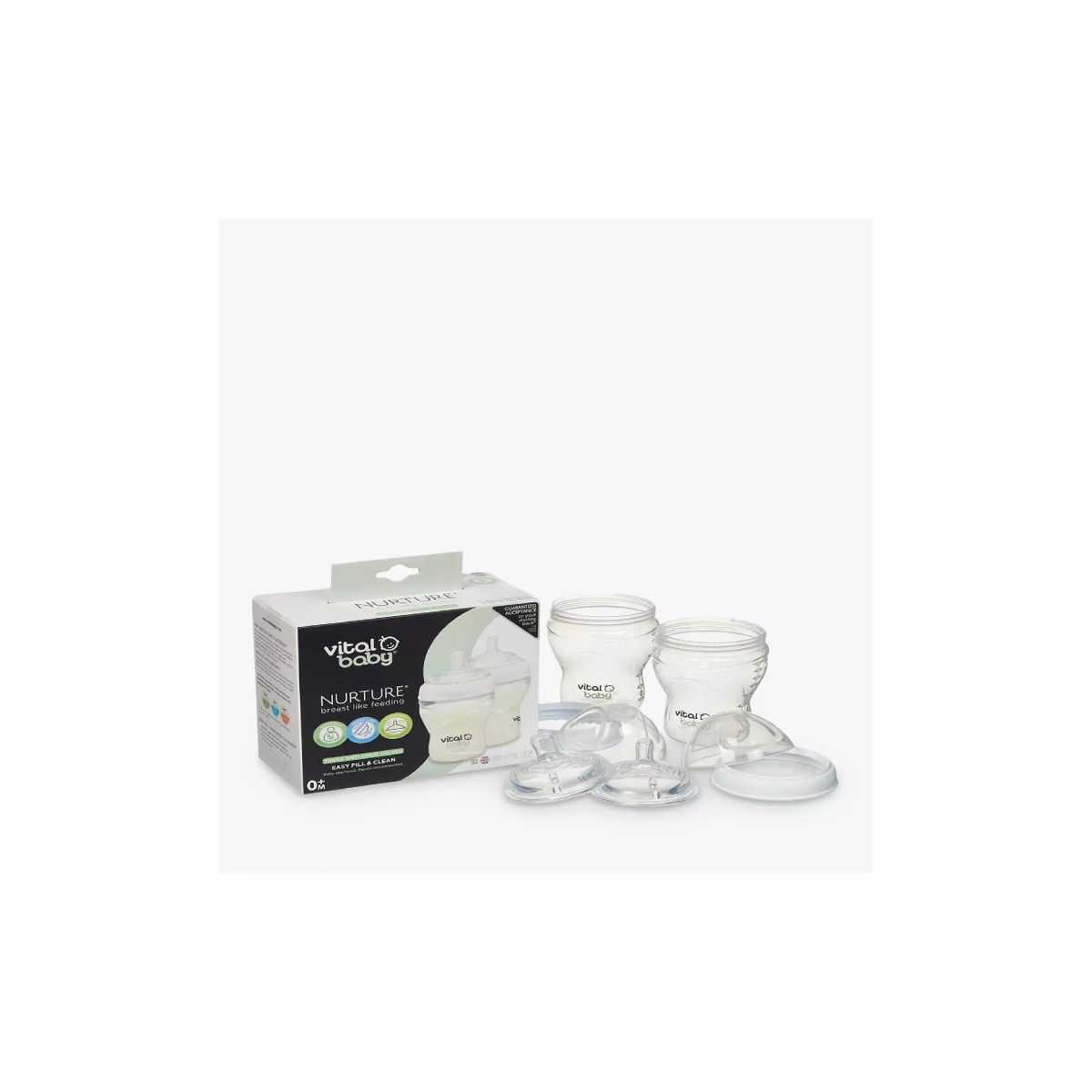 Key features of the vital baby nurture breast like feeding bottle are: expertly designed to mimic mum?s breast, the teat flexes like mum?s nipple. Advanced triple anti-colic valves to reduce air intake. Silicone is soft and smooth against baby?s delicate face. Easy latch teat. Bottles are easy to clean and fill due to the wide neck. BPA-free. 2 pack 240ml baby bottles. 0-6 Months. As little ones grow so fast, vital baby offer a range of teats with varying flow rates to keep up with your growing baby. For hygiene and safety reasons, it is recommended that the teats should be replaced at regular intervals. Each nurture breast like feeding bottle comes with a slow flow teat as standard, additional flow rates are available separately. Whichever feeding method you choose; either baby bottles or breast feeding (or a combination of both) the vital baby nurture breast like feeding bottle is the natural choice for you and your baby. The unique shaped teat not only helps reduce the risk of colic, but it has been expertly designed to mimic mums? breast. This will give your baby the most natural, breast like feeding experience possible. The extra wide silicone teats are soft and smooth against baby’s delicate face, with no hard plastic in the way. Features: Expertly designed to mimic mum?s breast, the teat flexes like mum?s nipple Flexzone – mimics the ways mums breast will move ensuring ultimate comfort for baby Easy latch – reduces confusion during combination feeding Advanced triple anti-colic valves to reduce air intake Acceptance guarantee – or your money back (see t&c’s in pack) Ideal for combination feeding 240 ml, 2 Pack