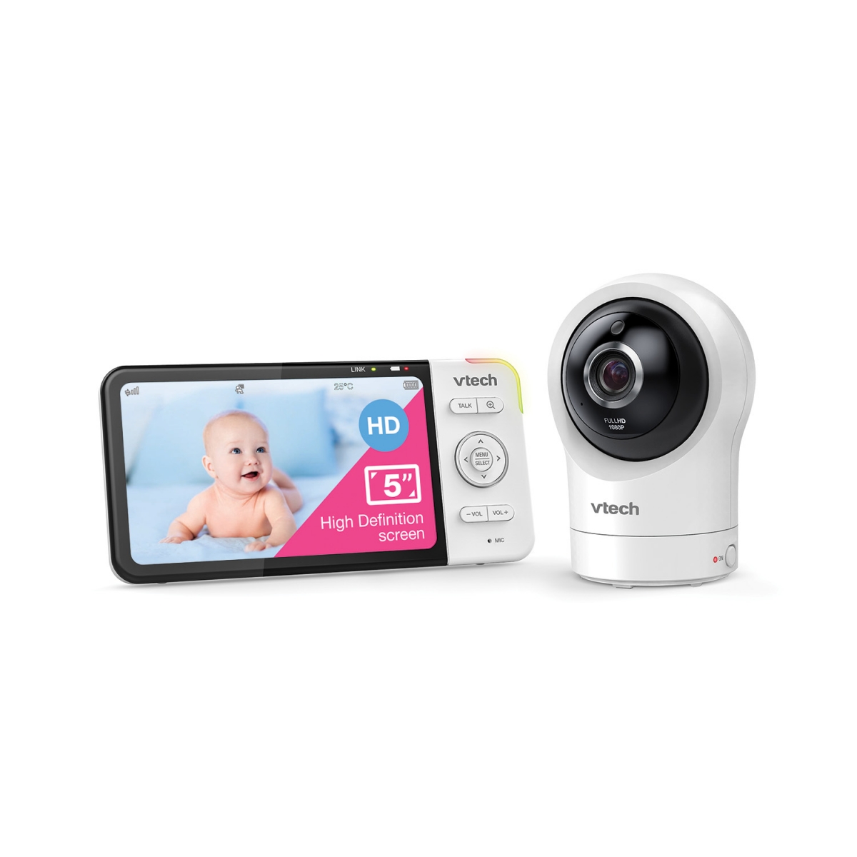 The VTech RM5764HD Smart Wi-Fi Video Baby Monitor with 5? display and 1080p HD 360 degree panoramic viewing Pan & Tilt Camera allows you to check in on your little one from virtually anywhere?at home or remotely on your smart device. The HD camera uses your home?s Wi-Fi connection to capture movements and sounds. Watch your child in real time on the parent unit, or on the My VTech Baby 1080p app in high definition. The camera pans up to 360 degrees side-to-side, tilts up to 182 degrees up and down, and zooms up to 10 times. When viewing on your iOS or Android device, experience crystal-clear, high-definition video. Use voice commands to view the VTech camera on compatible Google Assistant devices. The VTech RM5764HD Smart Wi-Fi Video Baby Monitor with 5? display and 1080p HD 360 degree panoramic viewing Pan & Tilt Camera features soothing sounds and lullabies that play right from the camera unit to help baby sleep tight. Even after dark, you?ll be able to see your baby clearly thanks to automatic infrared night vision. Plus the built-in temperature sensor will let you know with an alert if the nursery is getting too hot or cold so you can adjust the thermostat. Features: Free live remote access via smartphone and tablet 360 degree Pan, tilt and zoom the camera from the parent unit or remotely High-definition, 5-inch color LCD screen 1080p full HD video quality Works with Google Assistant Wide-angle viewing up to 110 degrees On-board recording set for motion detection or on demand for special moments. Motion triggered video tracking and zoom. 10x remote digital zoom Local or remote two-way talk Soothing sounds and lullabies Temperature sensor 3-level sound indicator Wall-mountable Dimensions: Parent Unit: 6.56? x 1. 14? x 3. 63? Baby Unit: 2.95? x 3. 89? x 4. 38?