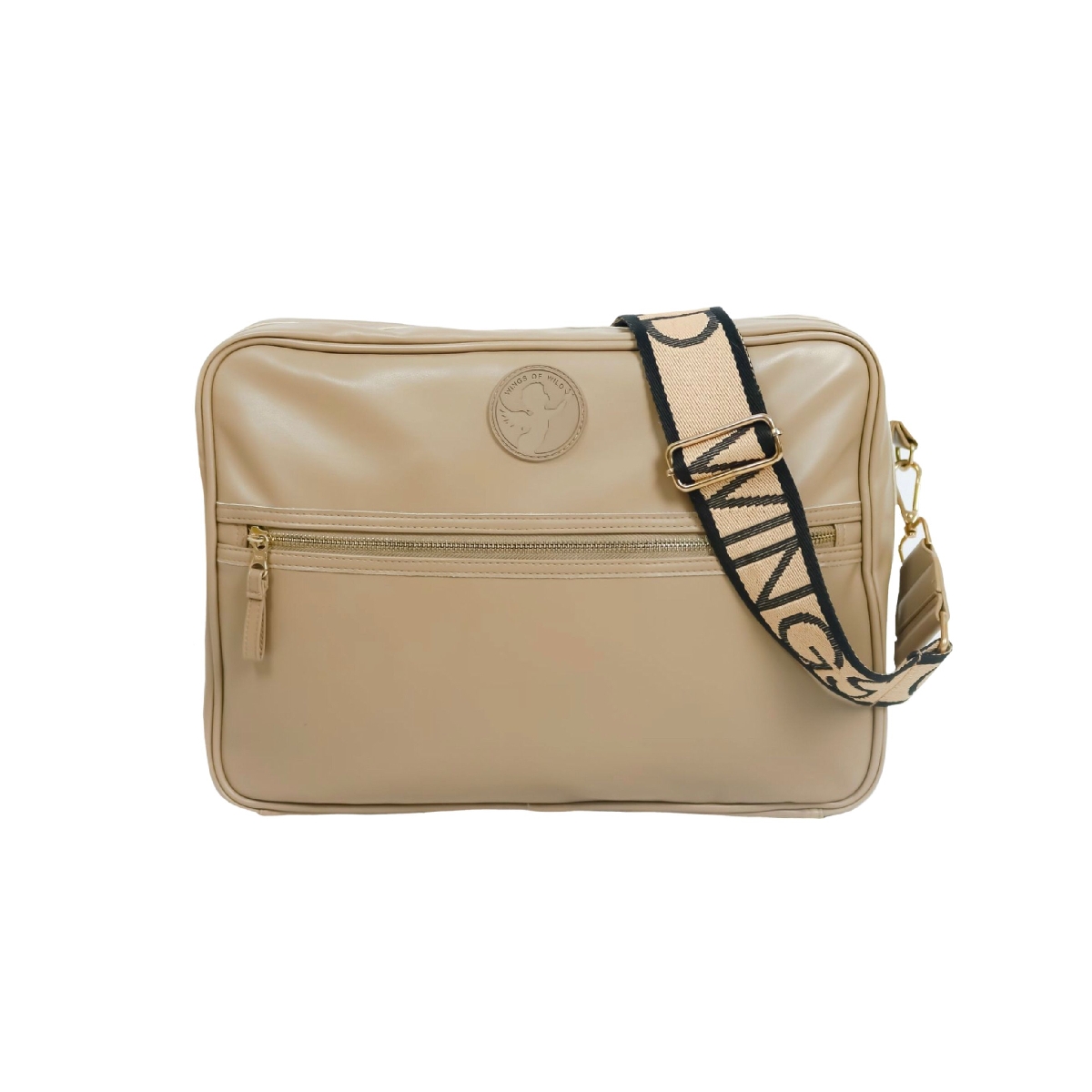 A soft luxurious artificial leather look bag with our woven chucky Wings of Wild shoulder strap and mini purse detail. Zip closure- with a unique butterfly detail opening that has never been used on a baby bag before, allowing you complete access to the 15 pockets. This Baby bag can change between a shoulder bag to a large clutch or can be attached to buggy with velcro straps provided with each purchase. Features: Gold -toned hardware Secure zip fastening 10 transparent internal pockets for easy accessibility Changing mat and wet wipe pouch Interior zippered dry compartments Wipe patch attaching to front on bag function ?You got this? positive embroidery affirmation inside lining Thermal bottle pockets for 2 baby bottles Matching Lambs leather look Velcro buggy straps Large woven shoulder strap in toasted almond and black font. Dimensions: Size: 10cm W x 27cm H x 26cm D